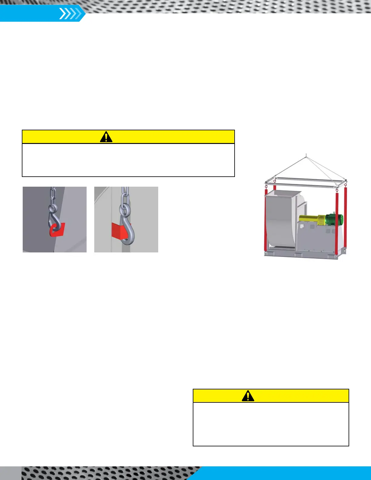 For fans provided without lifting lugs, use a forklift or pallet jack to handle the equipment. Consult a qualified person before lifting.