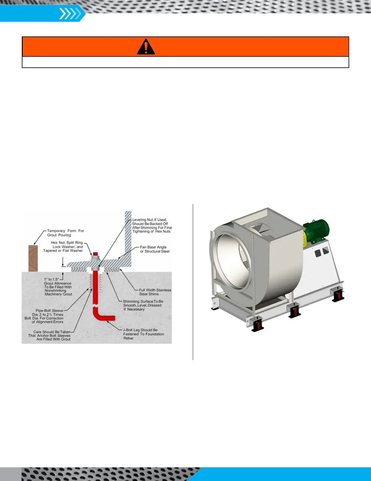 location and motor location are critical to final fan alignment. J or T type anchor bolts of sufficient size should be used and should be