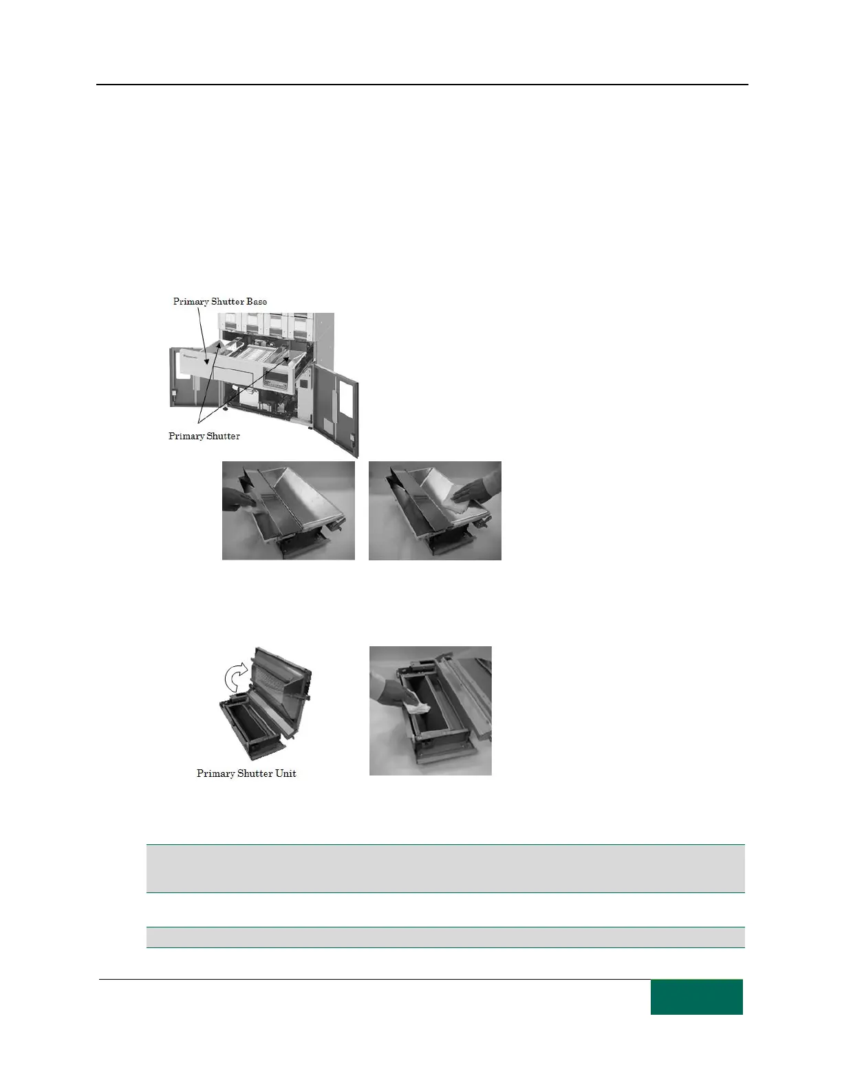 Open the primary shutter chute as shown below and wipe off pill dust collected in the moving parts of