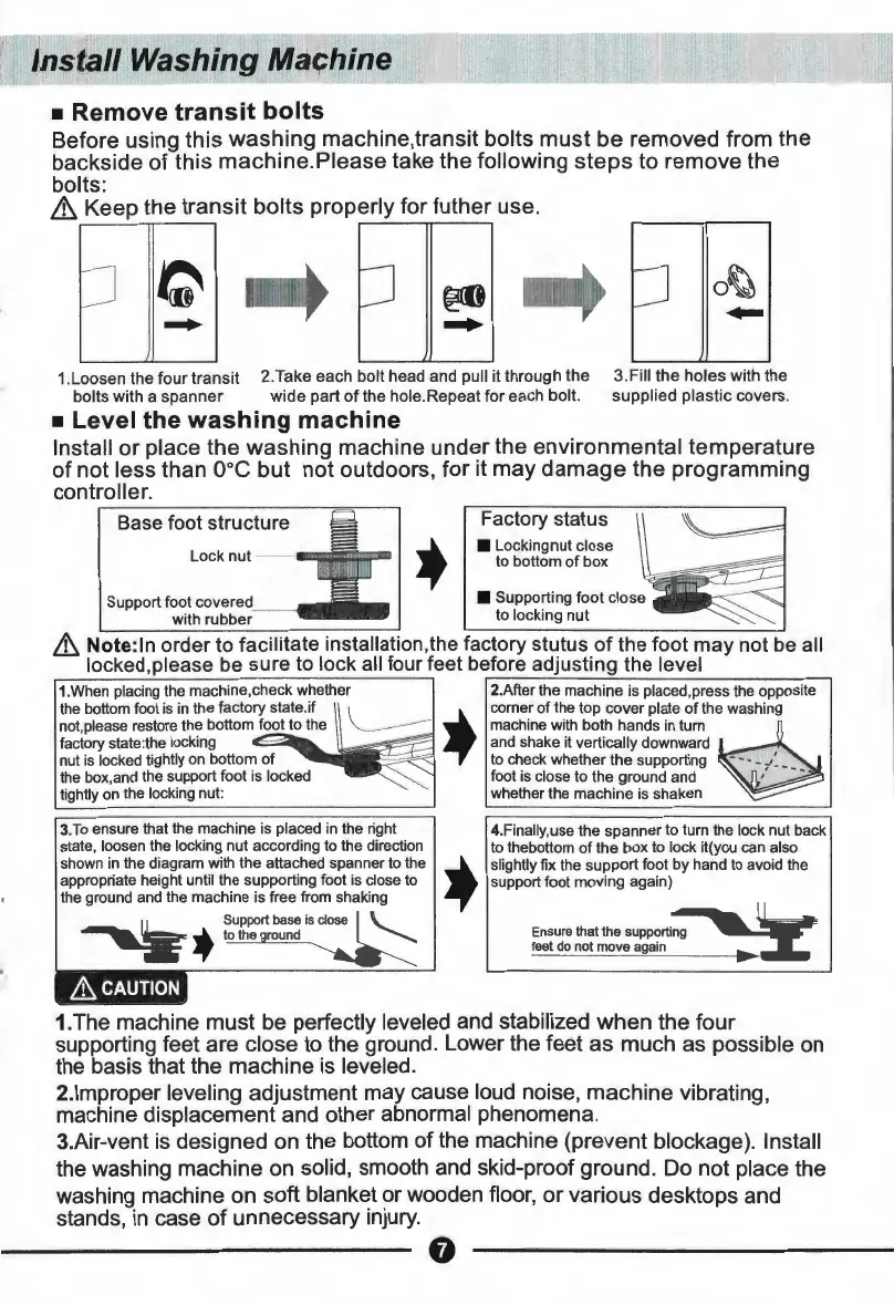 2.lmproper leveling adjustment may cause loud noise, machine vibrating,