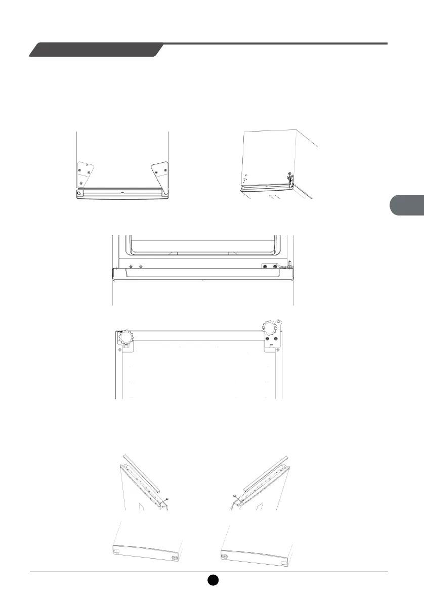3. Leg de koelkast neer en verwijder het onderste scharnier en de nivelleringshoek aan de onderkant van