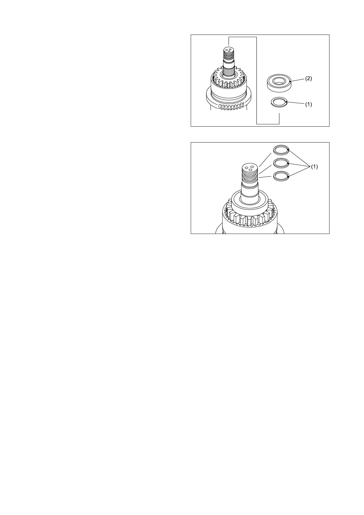 Install the thrust washer (1) and bearing (2).