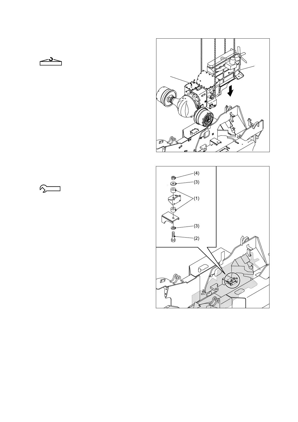 ① Lift the engine (1) and drive unit (2) over the