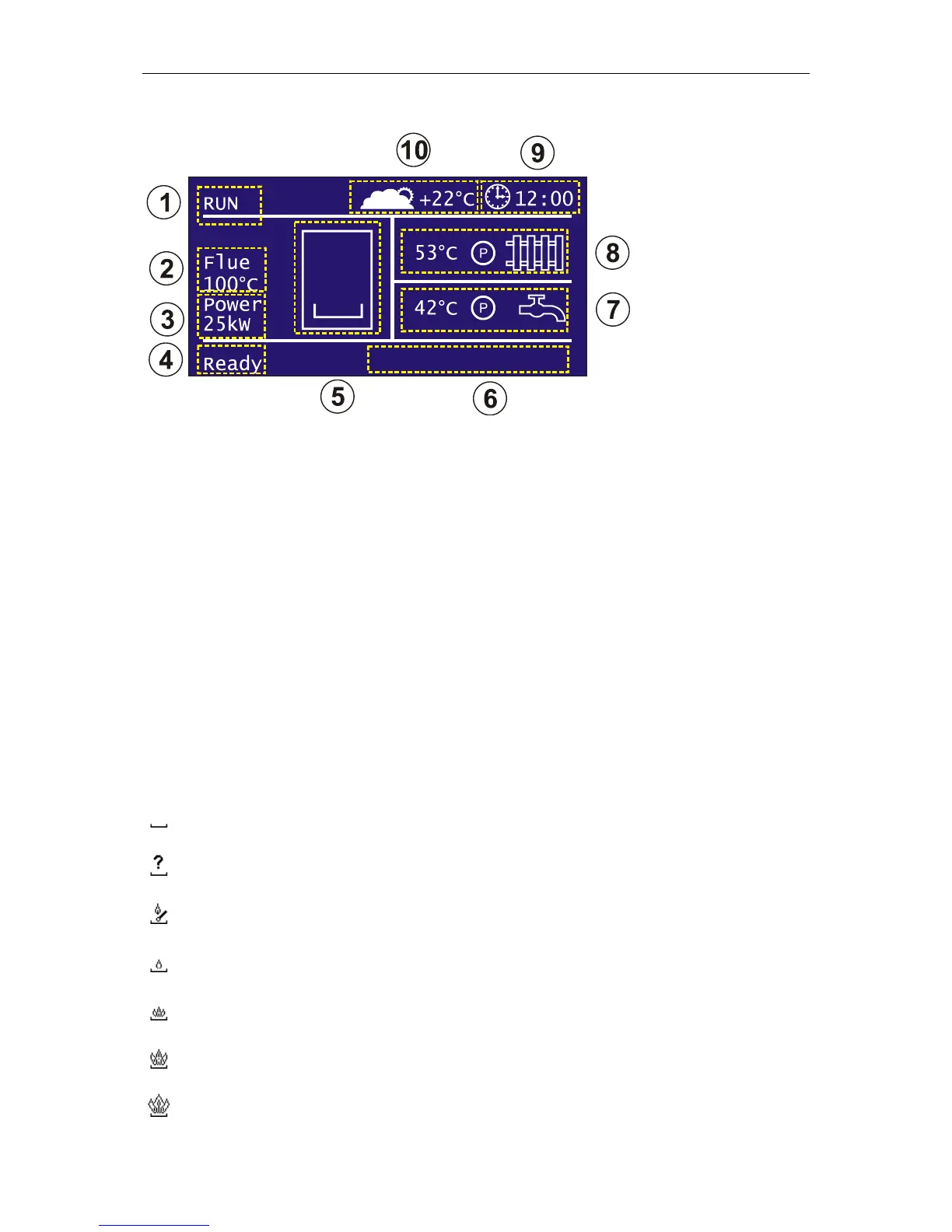 1. Power state: Indicates the current power state of your boiler. When it set to RUN, boiler will