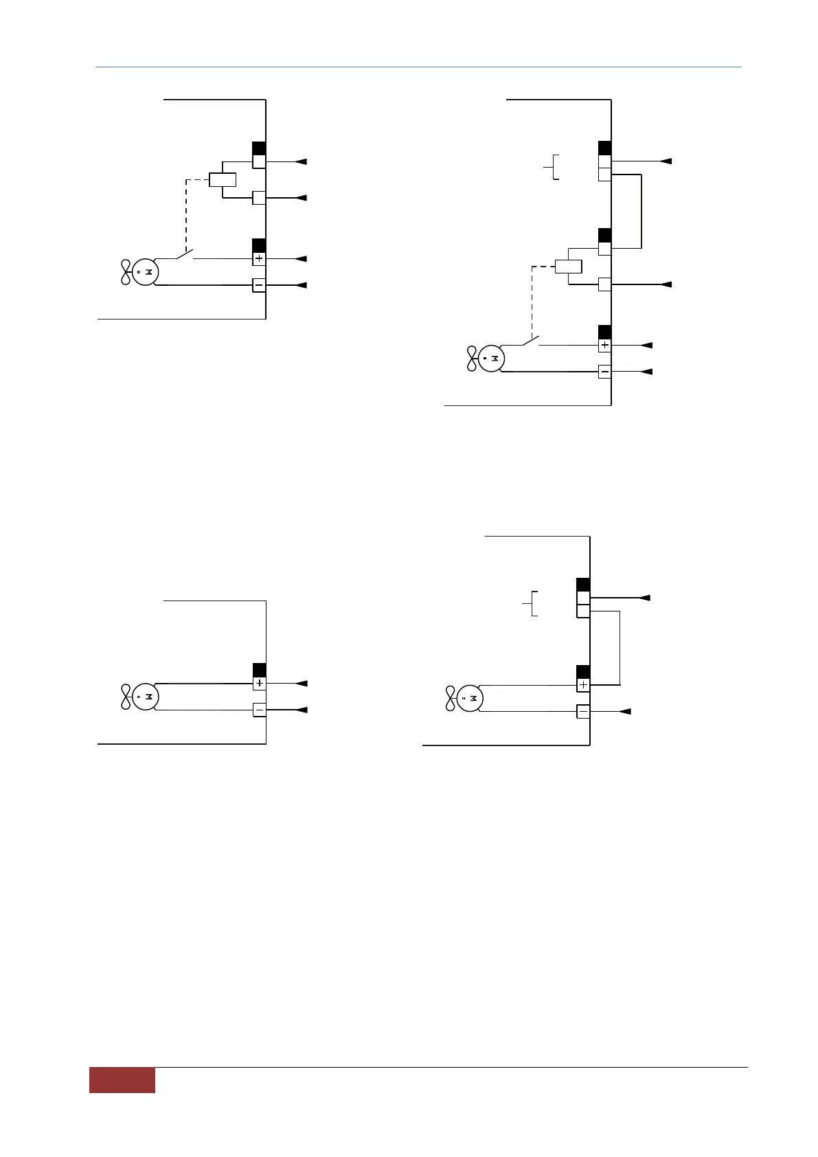 with fans always on. On the right, connection with fans controlled via L.O.x logical output set as "O32 – Enable DC-DC