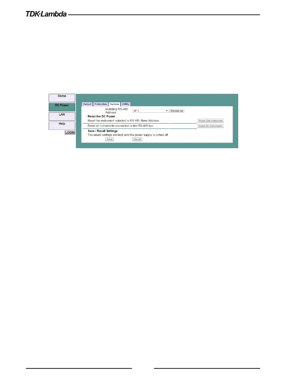 Recall (recalls the settings only for the supply selected in the RS-485 list box).