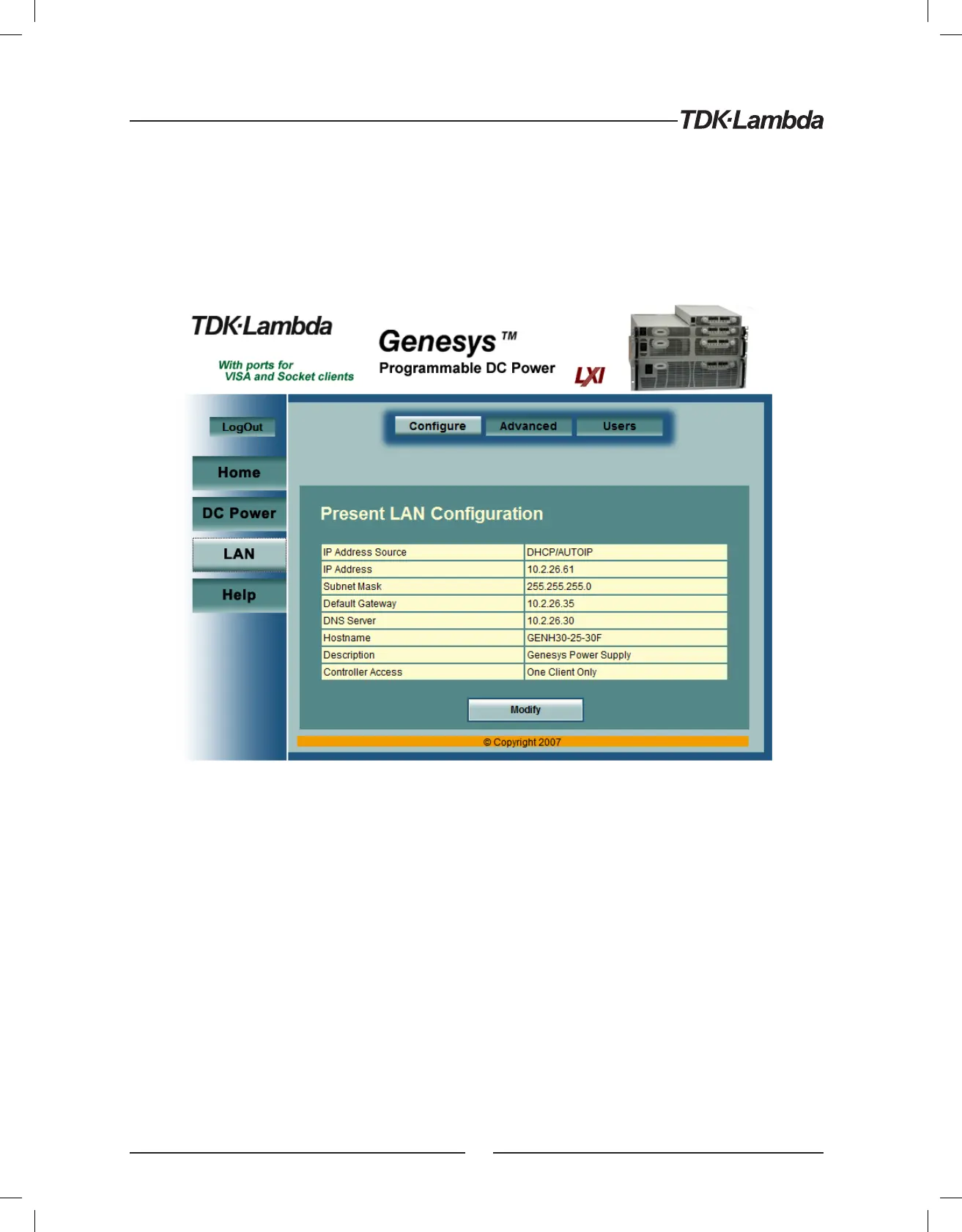 When the “LAN” tab is selected, the “Configure” panel opens: