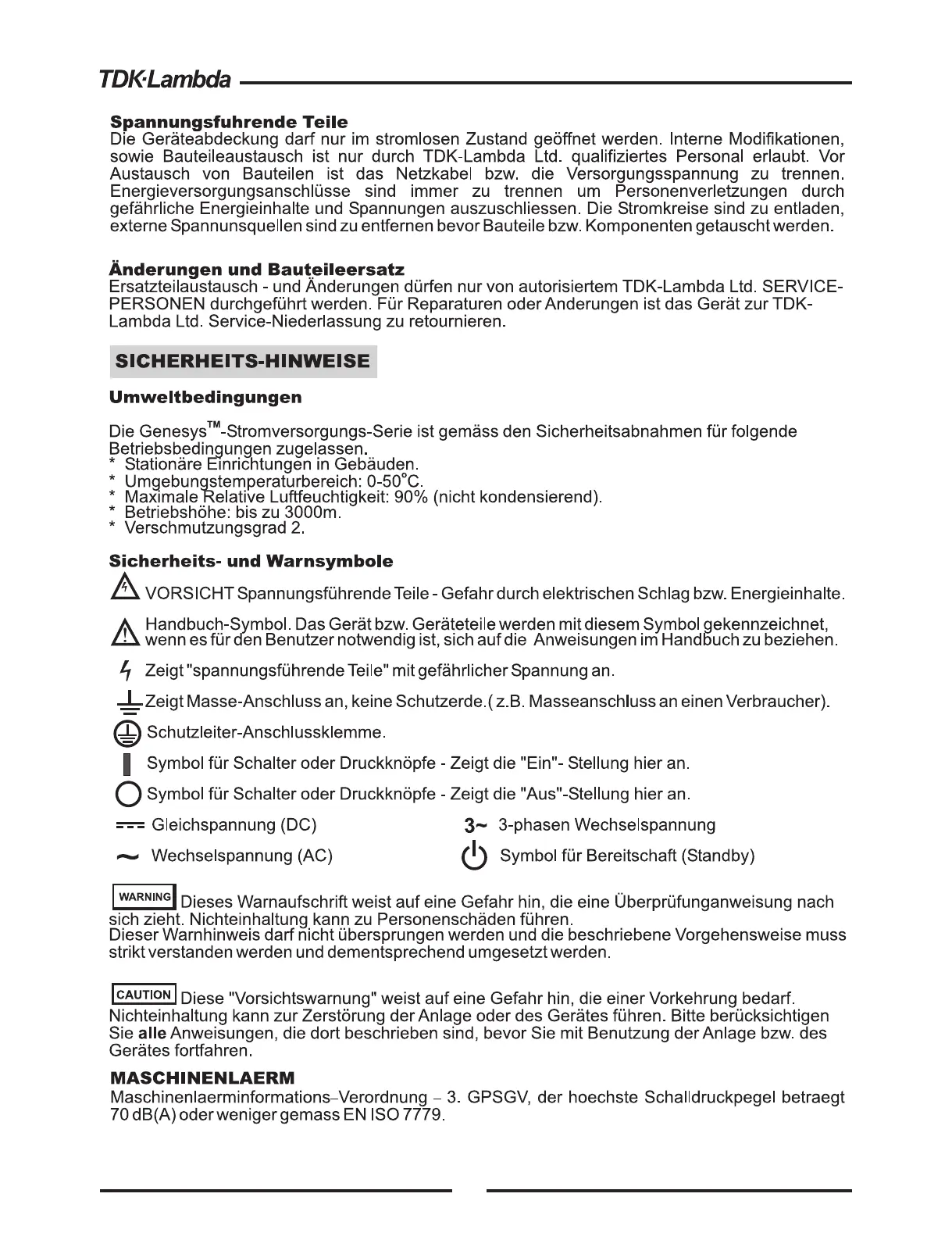 TDK-Lambda GENESYS GEN 5kW Series - Safety Instructions (German); Environmental Conditions; Safety and Warning Symbols; Machine Noise Information
