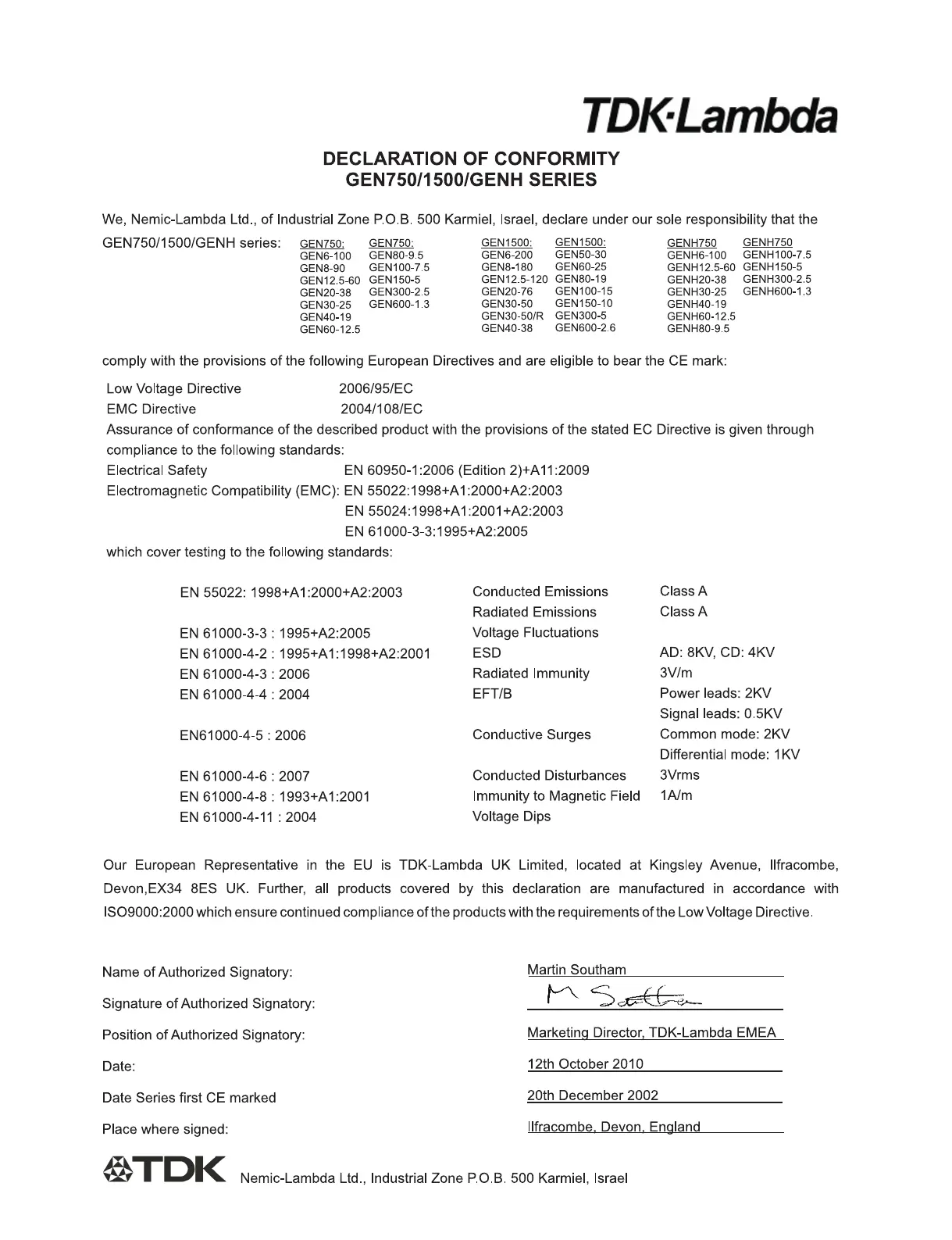 TDK-Lambda Genesys GEN30-50 - DECLARATION OF CONFORMITY