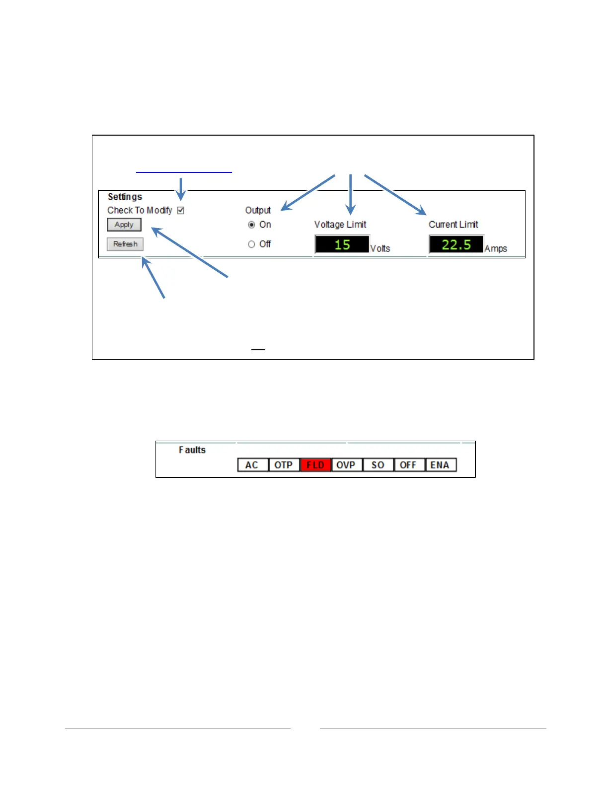 Settings: These fields show, and allow you to change, the selected power supply’s