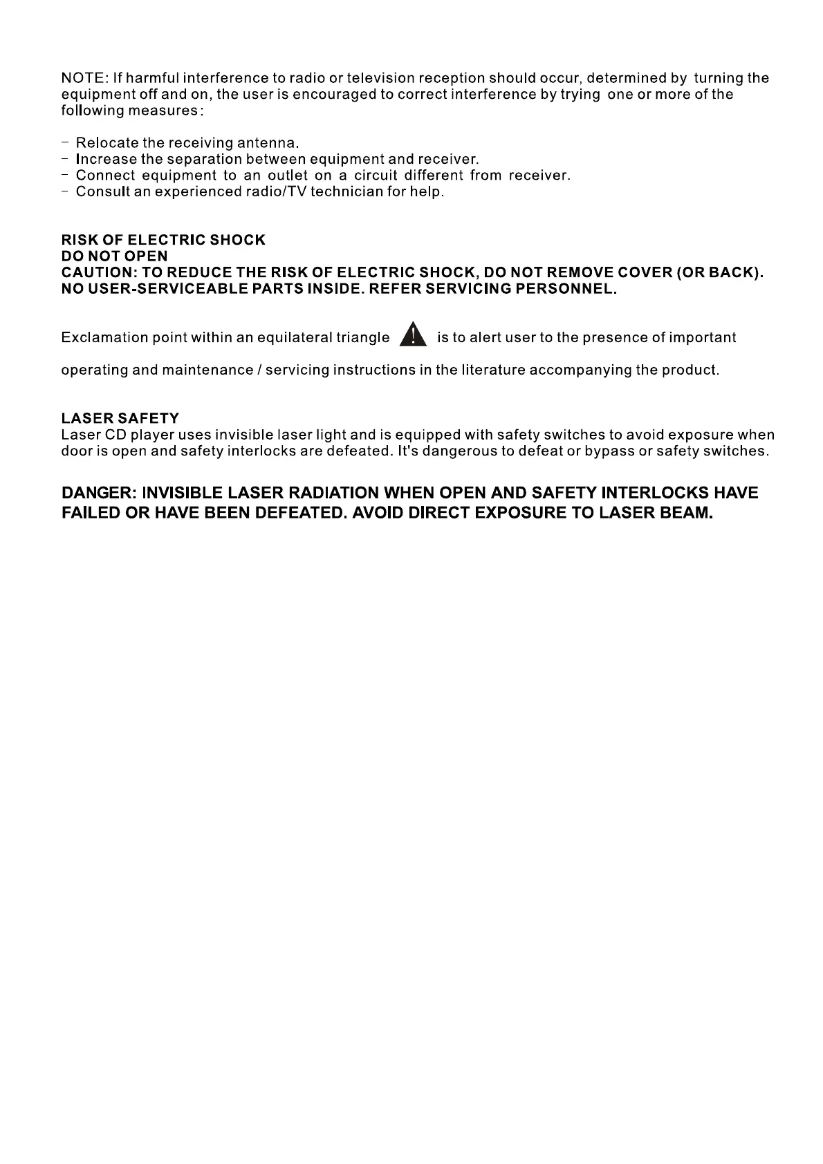 TDK NX-03CDMP3 - Specific Safety Advisories; Radio Interference Correction; Laser Safety Information