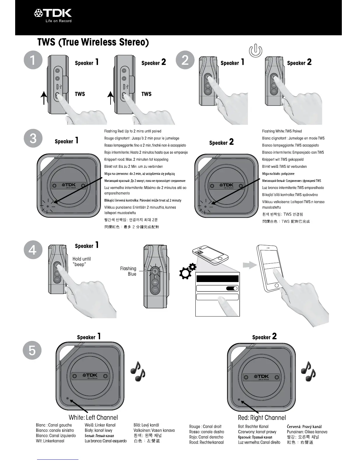 TDK TREK Micro - True Wireless Stereo (TWS) Setup; Connecting Two Speakers for TWS; TWS Pairing Status Indicators; TWS Channel Assignment