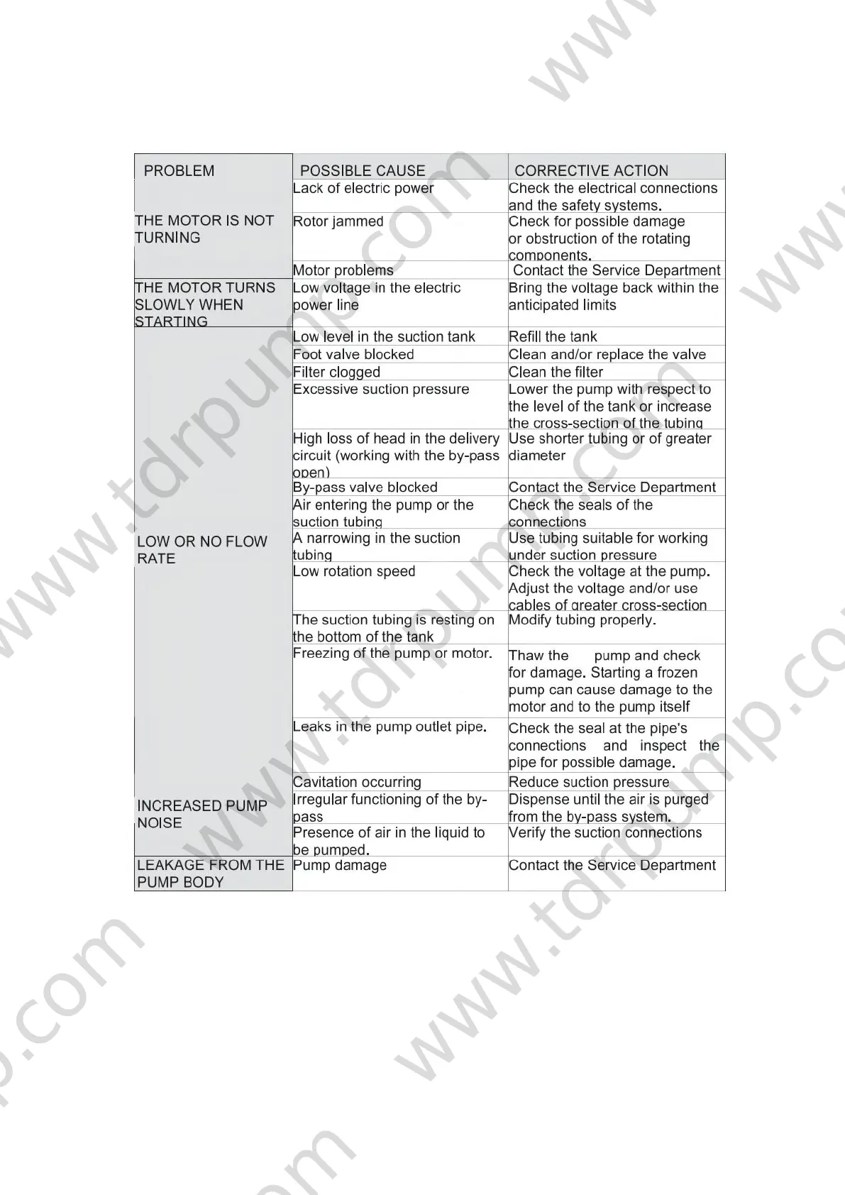 TDRFORCE FL-540B - Possible Working Defects; The Motor Is Not Turning; The Motor Turns Slowly When Starting; Low Or No Flow Rate