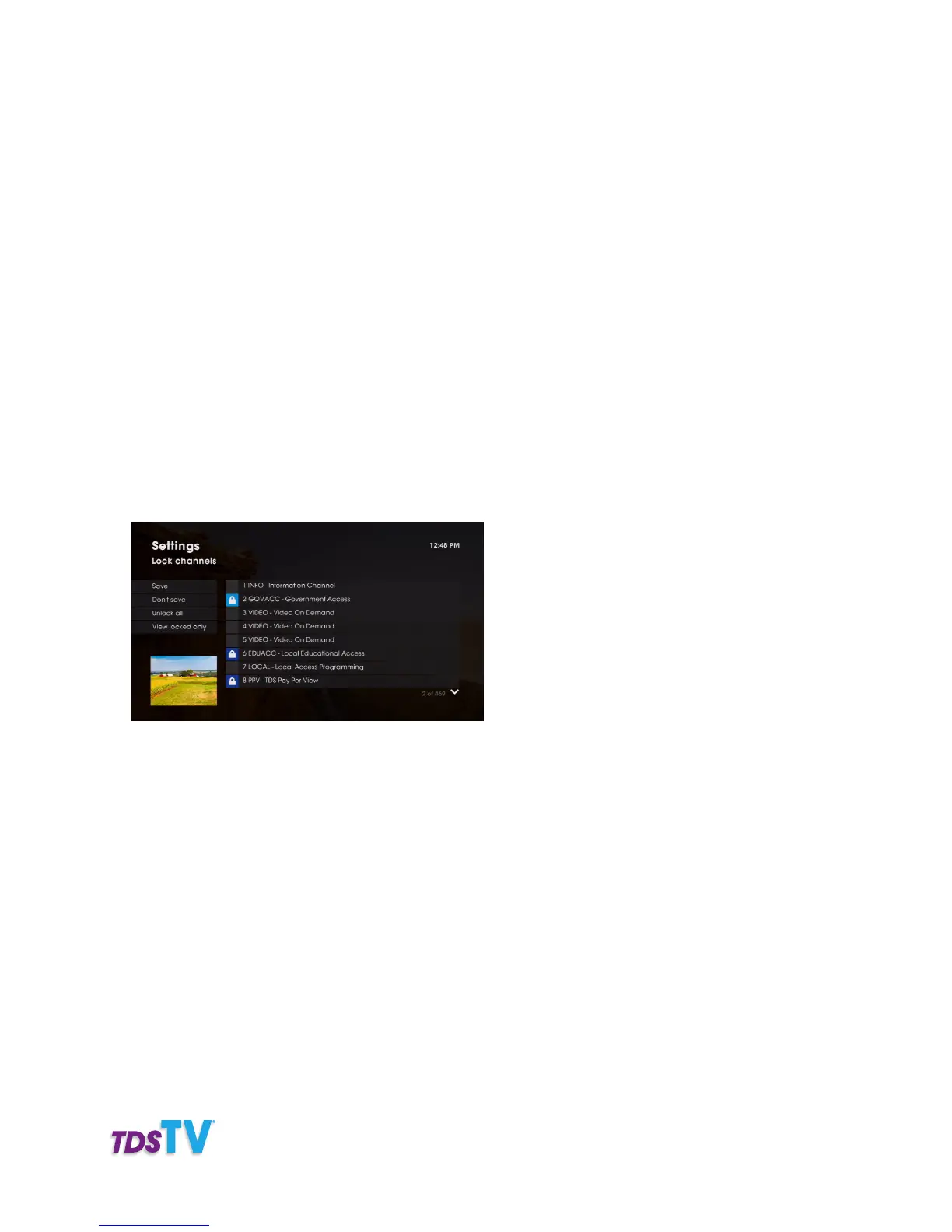 category. Press OK. The Settings screen appears with a list of all TDS TV channels you subscribe to.