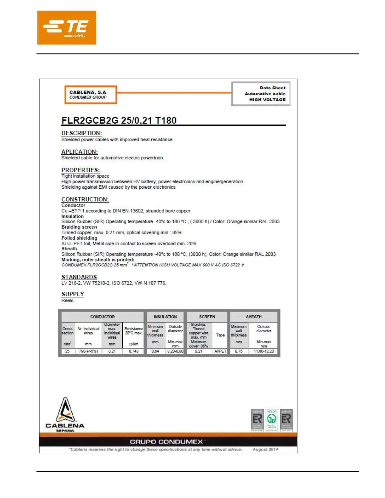 8.1.4 Cablena wire size 25mm² / Datenblatt Cablena Leitungsquerschnitt 25mm²