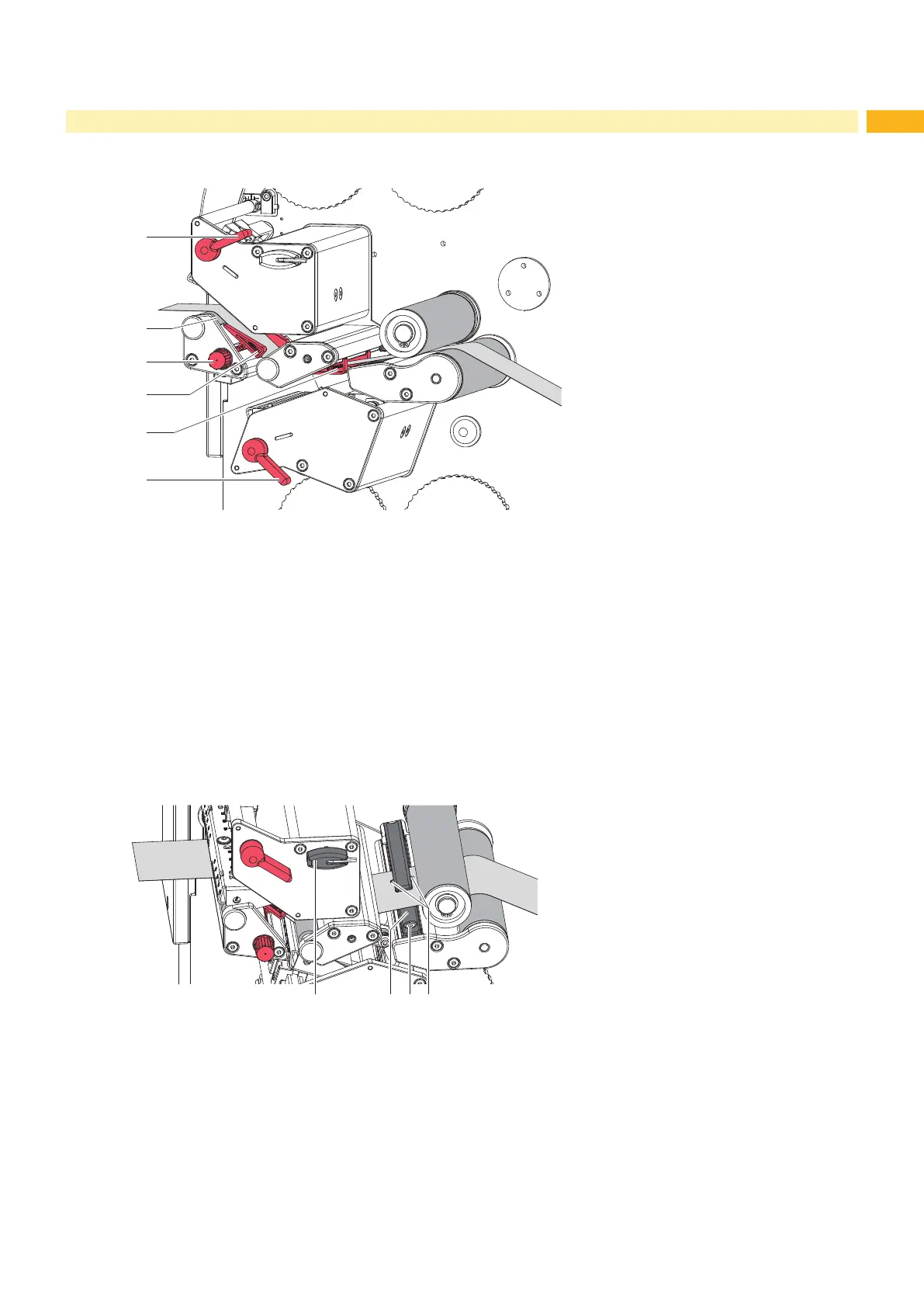 1. Turn lever (1) counterclockwise and lever (6) clockwise to lift both printheads.