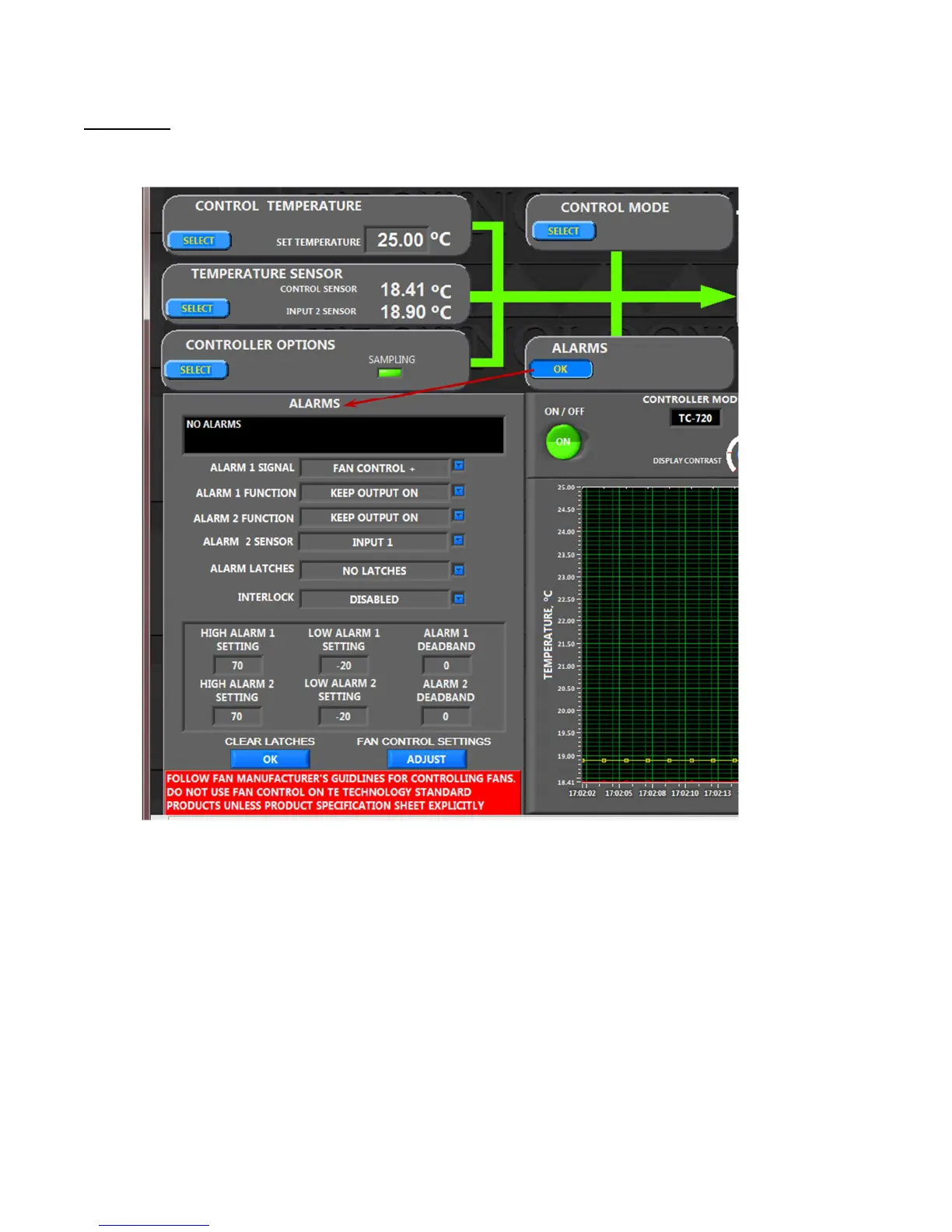 The ALARMS text box will indicate the nature of the alarm if an alarm conditions exists.