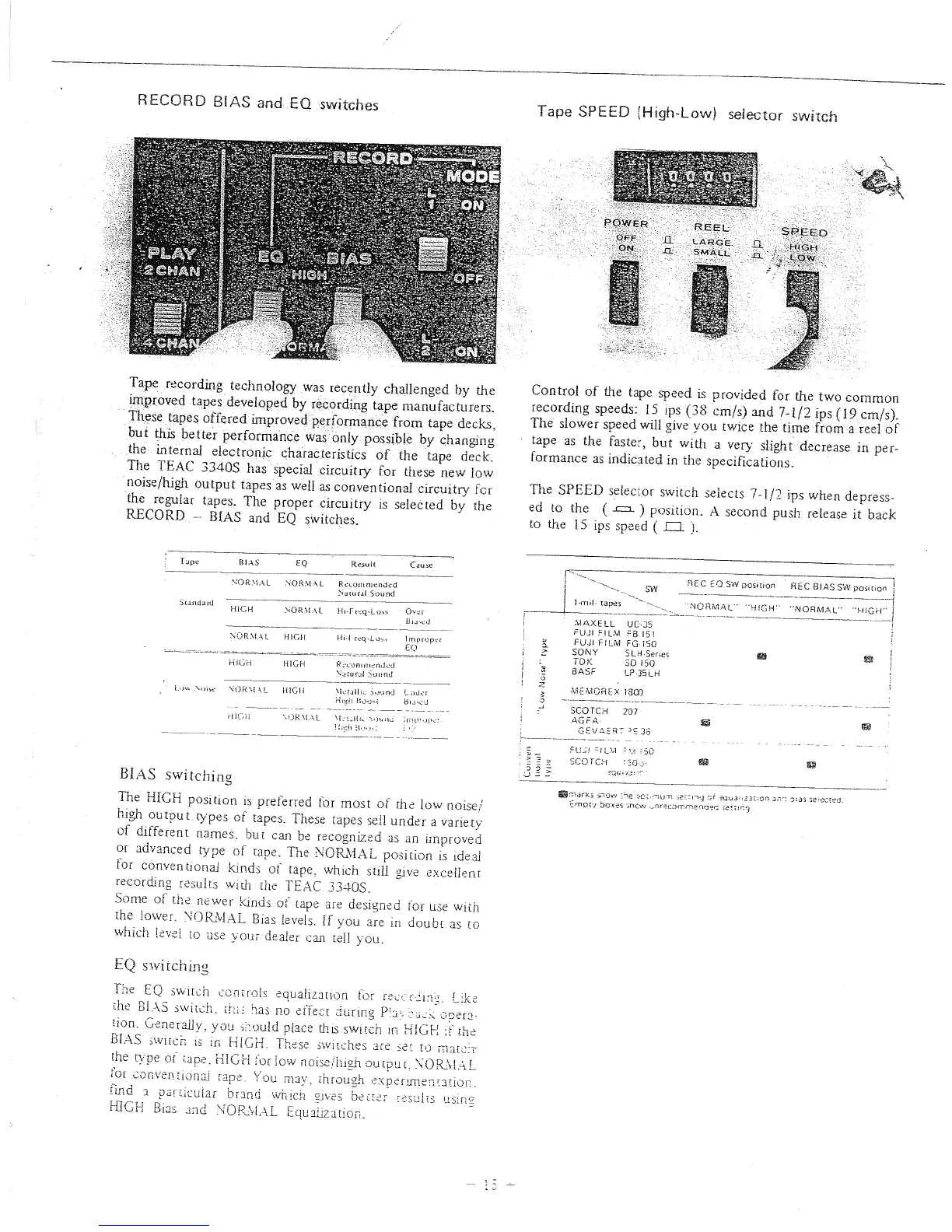 Teac 3340S - RECORD BIAS and EQ Switches; Tape SPEED (High-Low) Selector Switch; BIAS Switching Guide; EQ Switching Guide