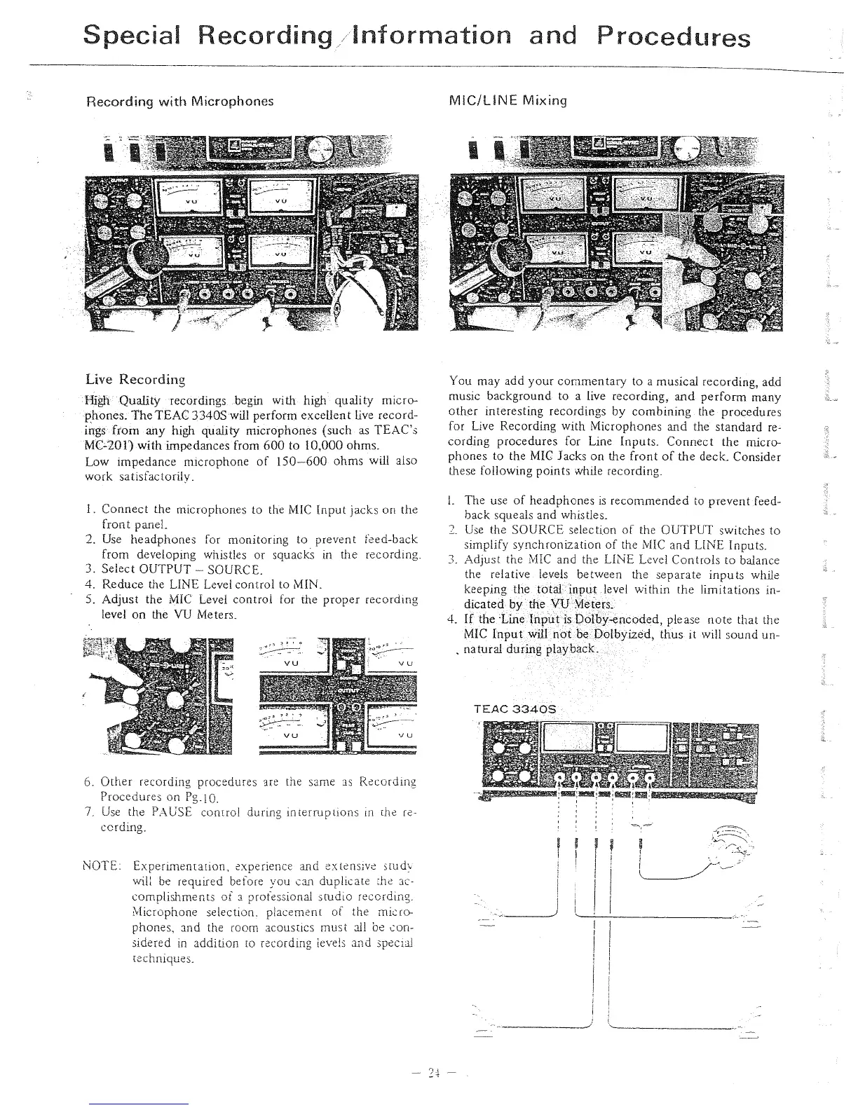 Teac 3340S - Special Recording Procedures; Recording with Microphones; MIC;LINE Mixing; Live Recording Tips