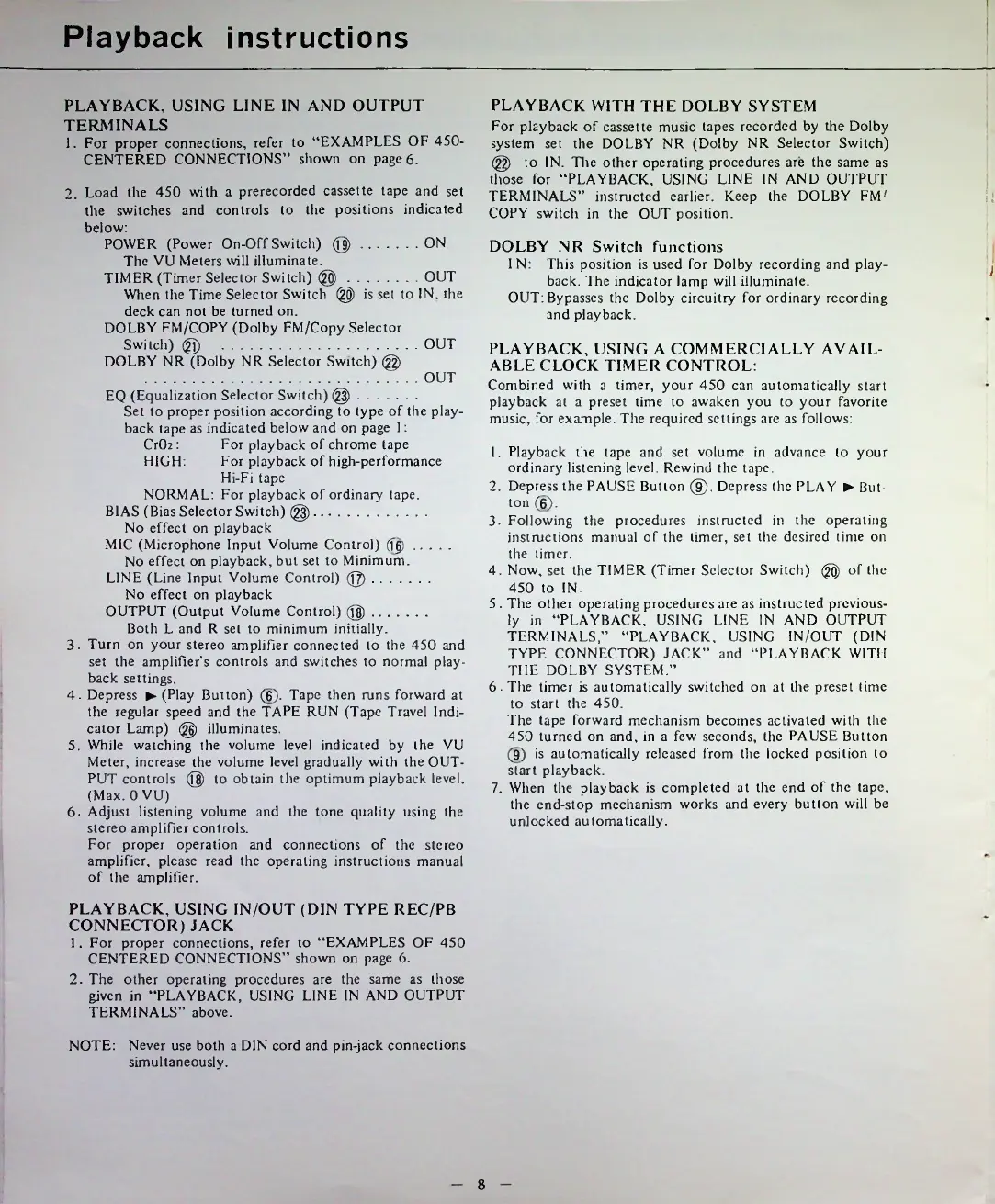 Teac 450 - Playback Instructions; Playback via Line;Output Terminals; Playback via DIN Connector Jack; Playback with Dolby System