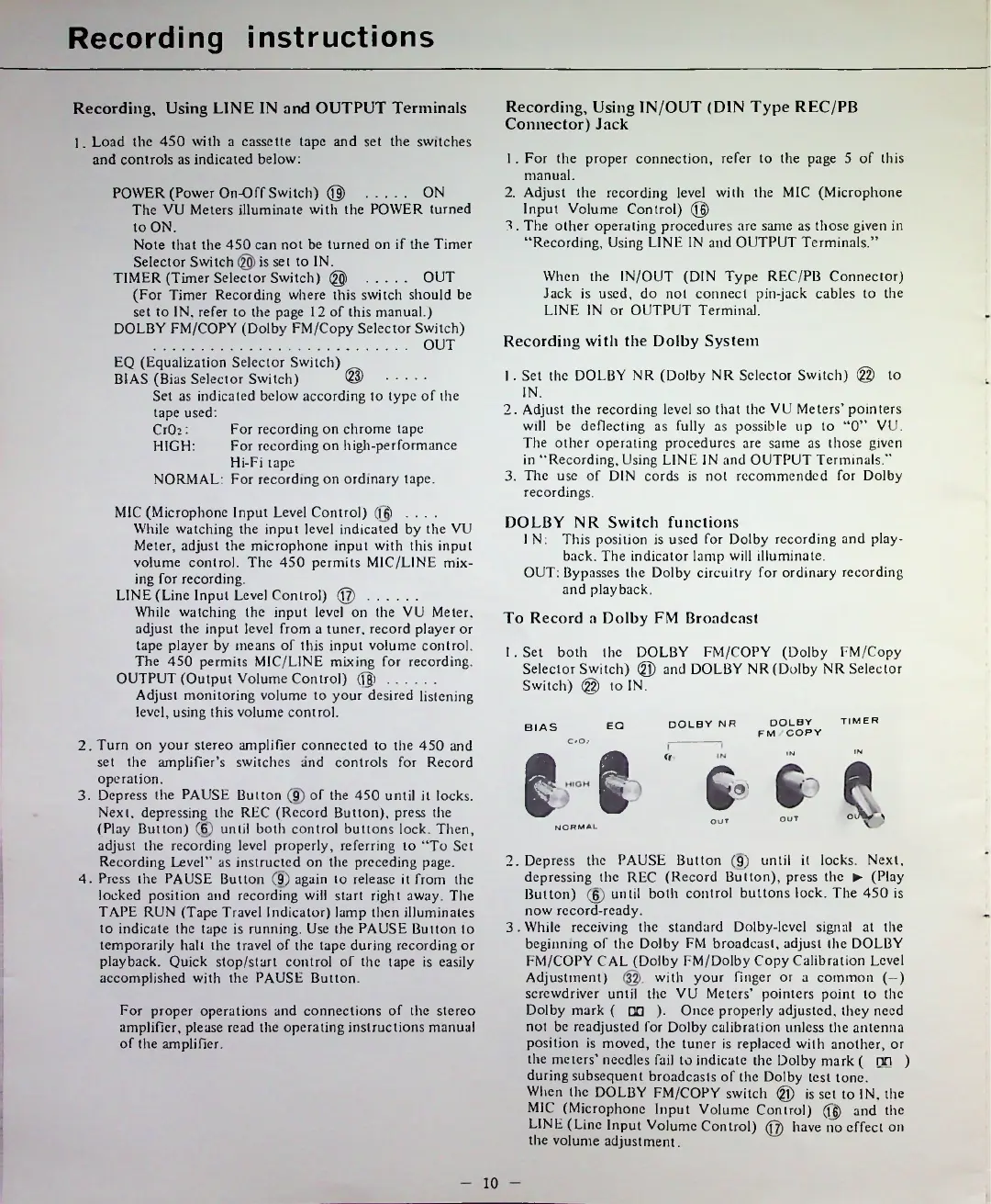 Teac 450 - Recording Instructions; Recording with Line;Output Terminals; Recording with DIN Connector Jack; Recording with the Dolby System