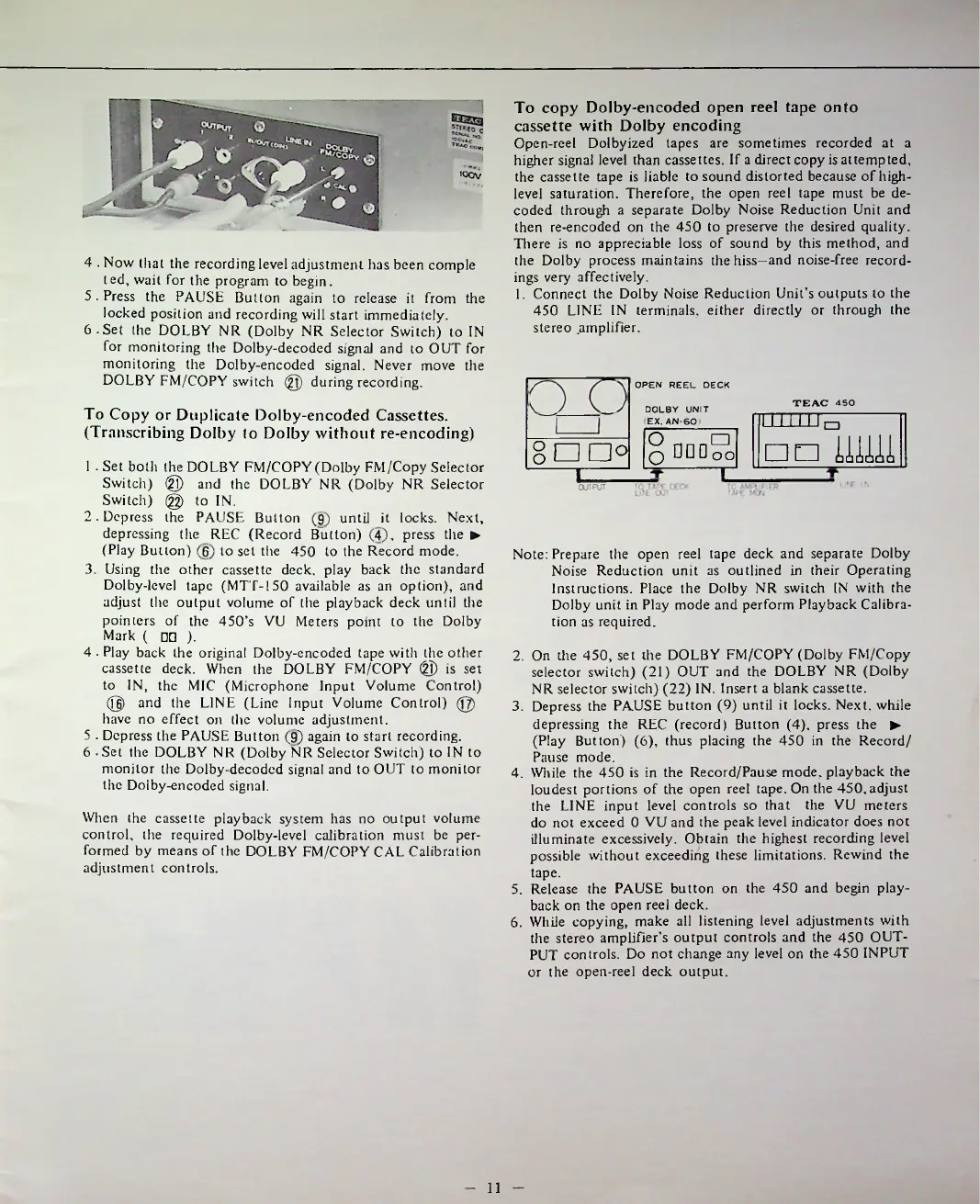 Teac 450 - Copying and Duplicating Cassettes; Copying Dolby Cassettes; Copying Open Reel to Cassette