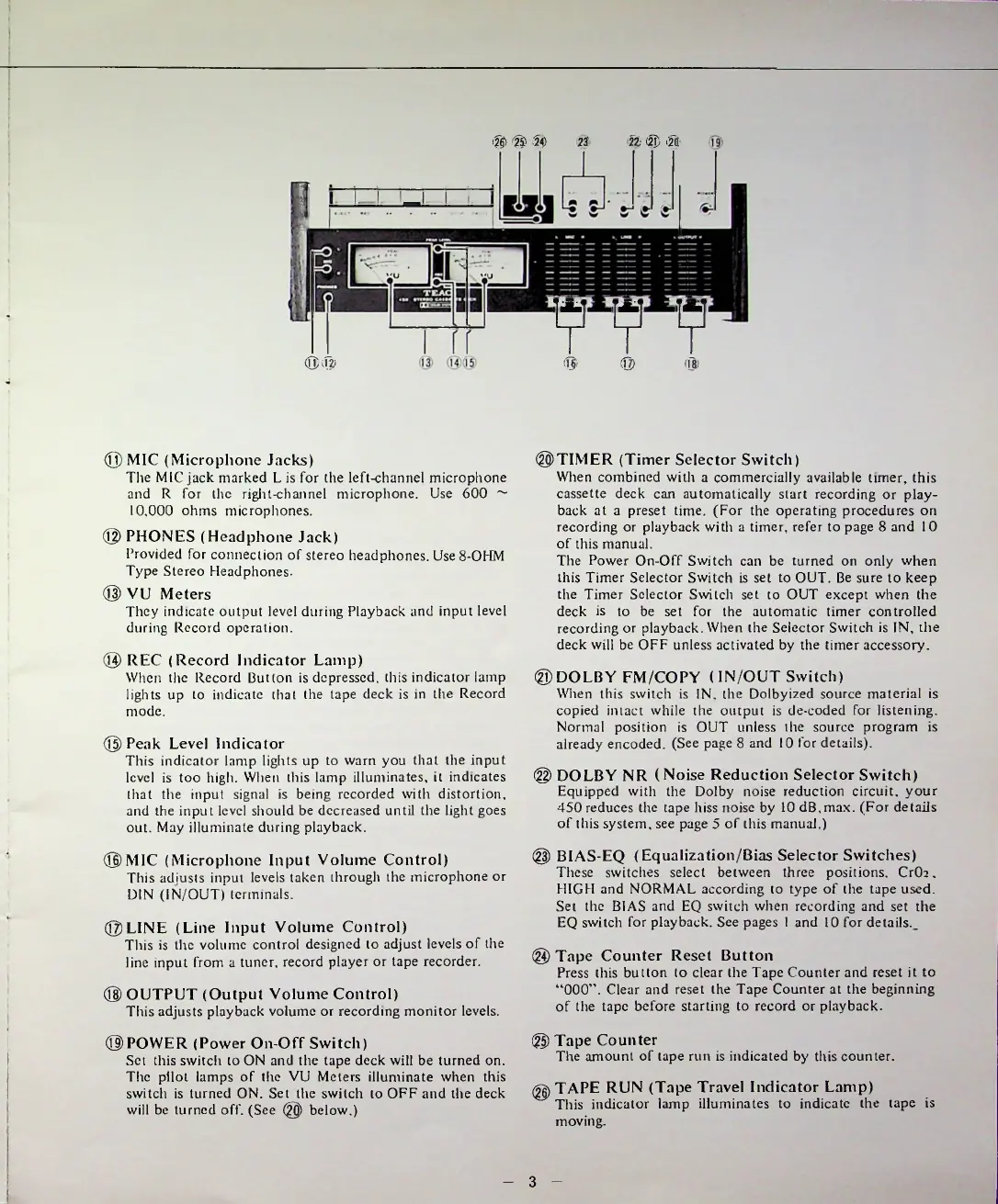 Teac 450 - Function of Controls - Part 2: Indicators and Input Controls; Microphone and Headphone Jacks; VU Meters and Indicator Lamps; Input Volume Controls