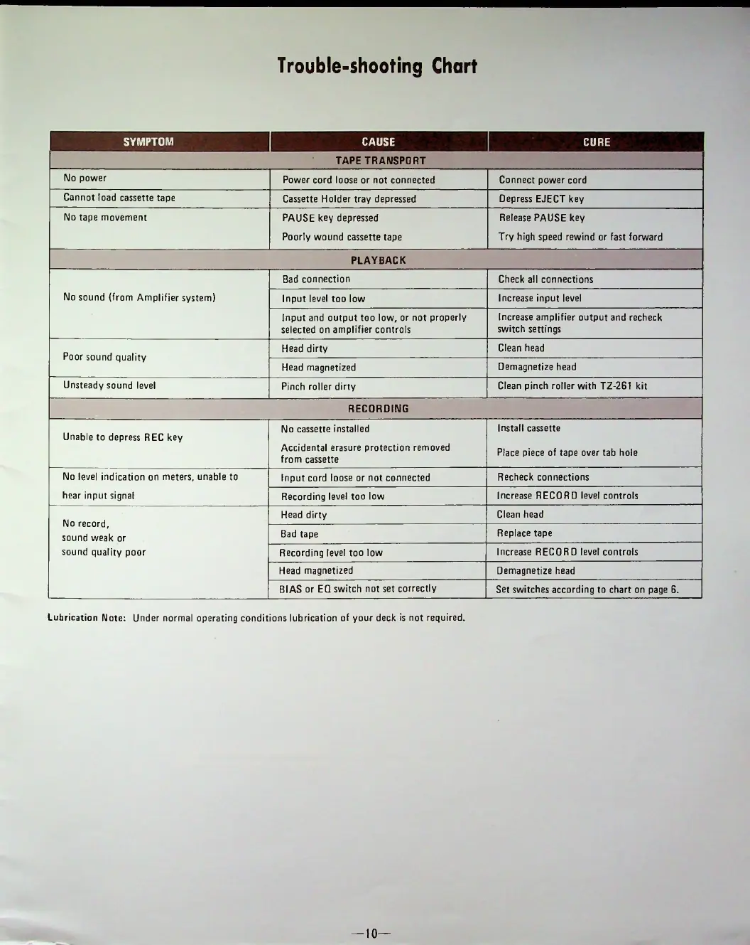 Teac A-100 - Troubleshooting Chart; Tape Transport