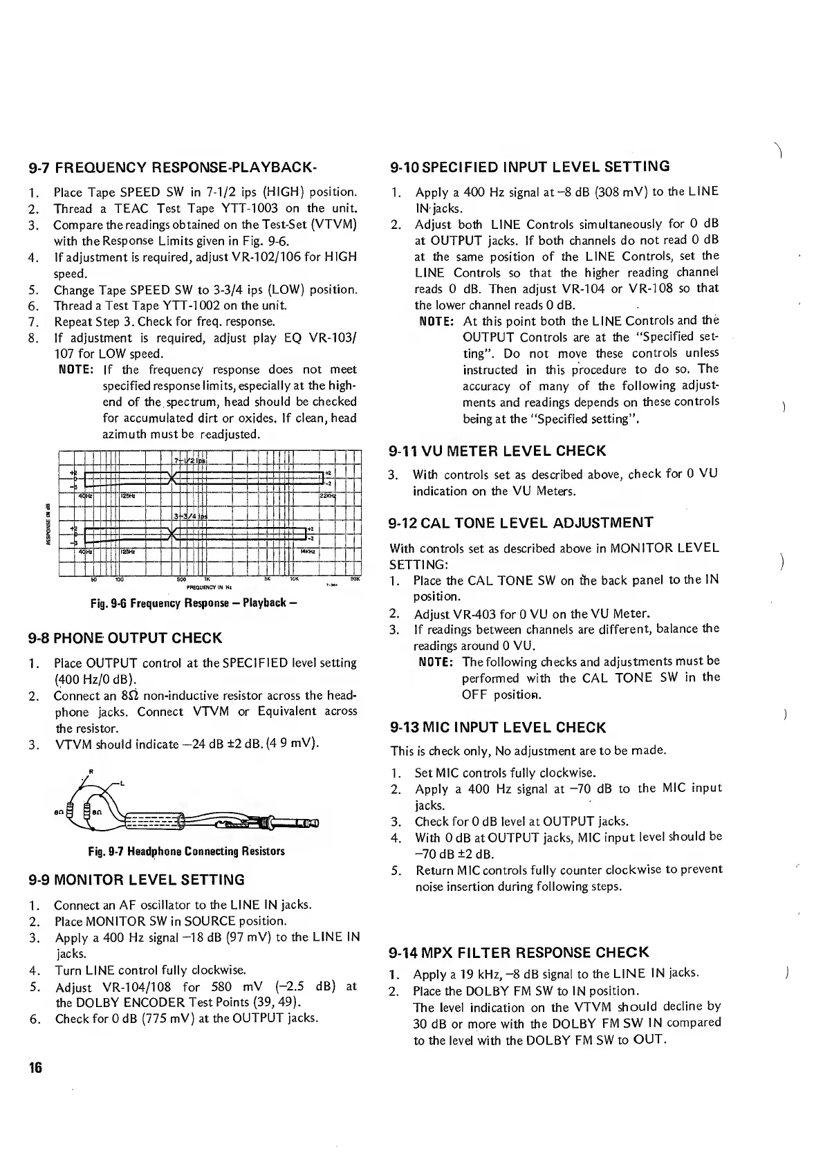 Teac A-2300SD - Frequency Response-Playback-; Phone Output Check; Monitor Level Setting; Specified Input Level Setting