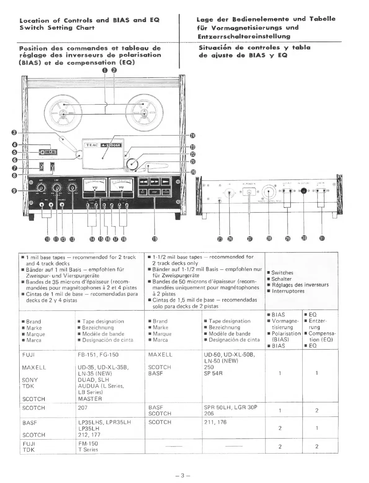 Teac A-2300SX - Controls and BIAS;EQ Settings; Location of Controls and BIAS and EQ Switch Setting Chart