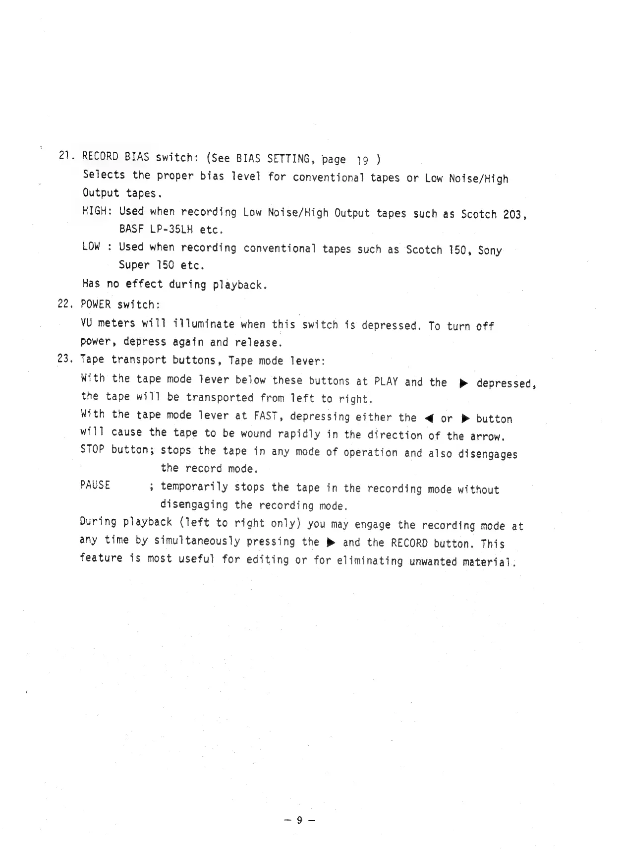 Teac A-2340 - Tape transport buttons, Tape mode lever; Bias Setting