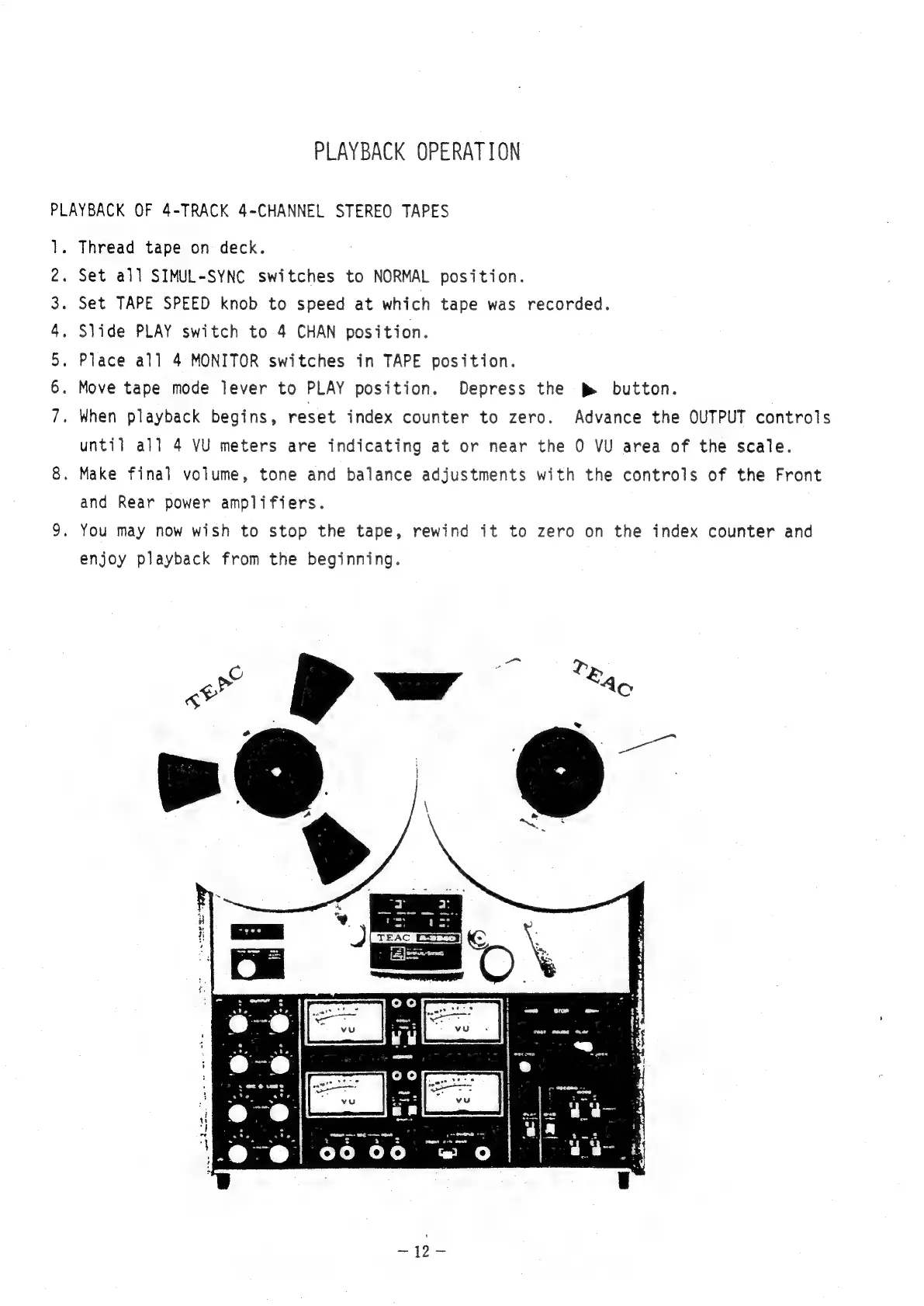 Teac A-2340 - Playback Operation; Playback of 4-Track 4-Channel Stereo Tapes