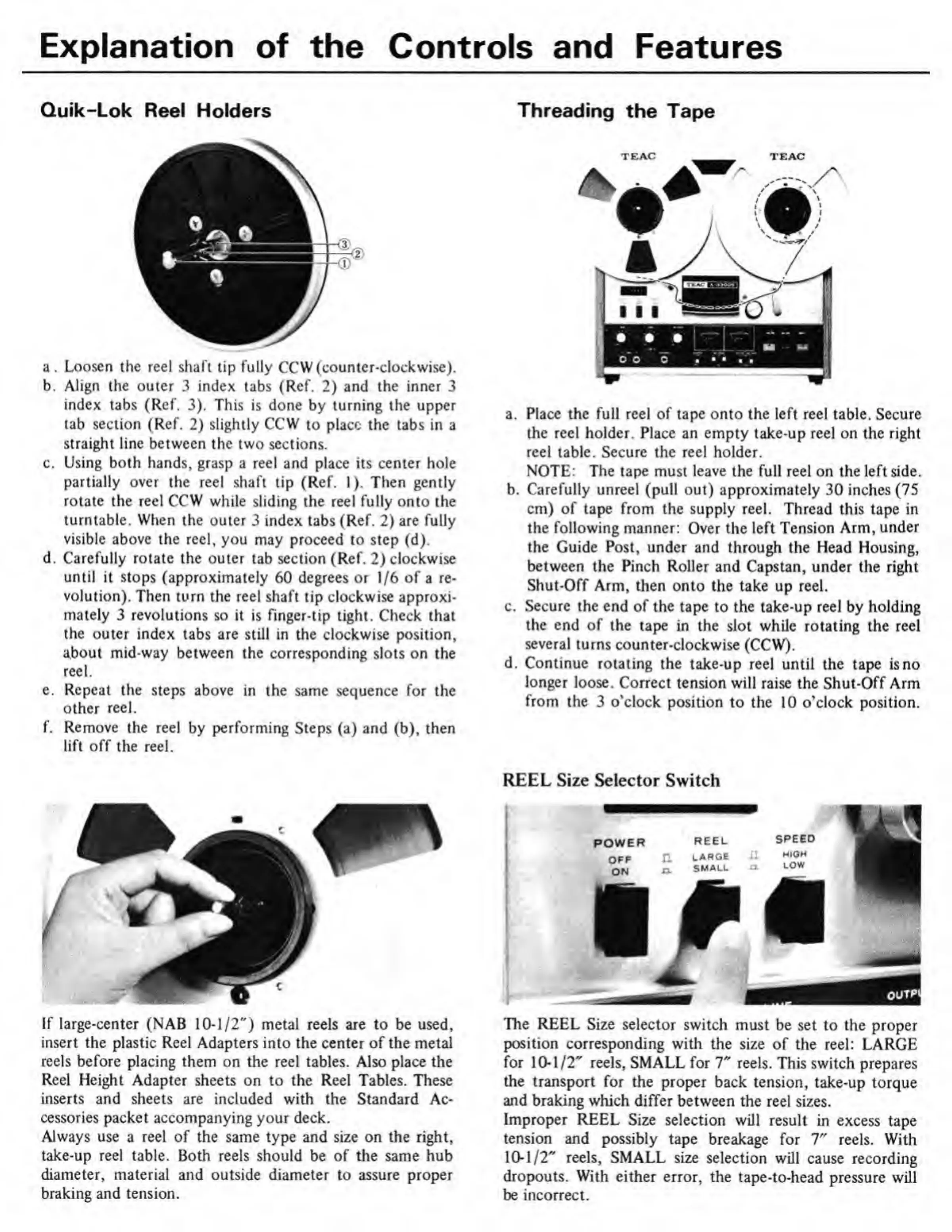 Teac A-3300S - Explanation of Controls and Features; Threading the Tape; REEL Size Selector Switch