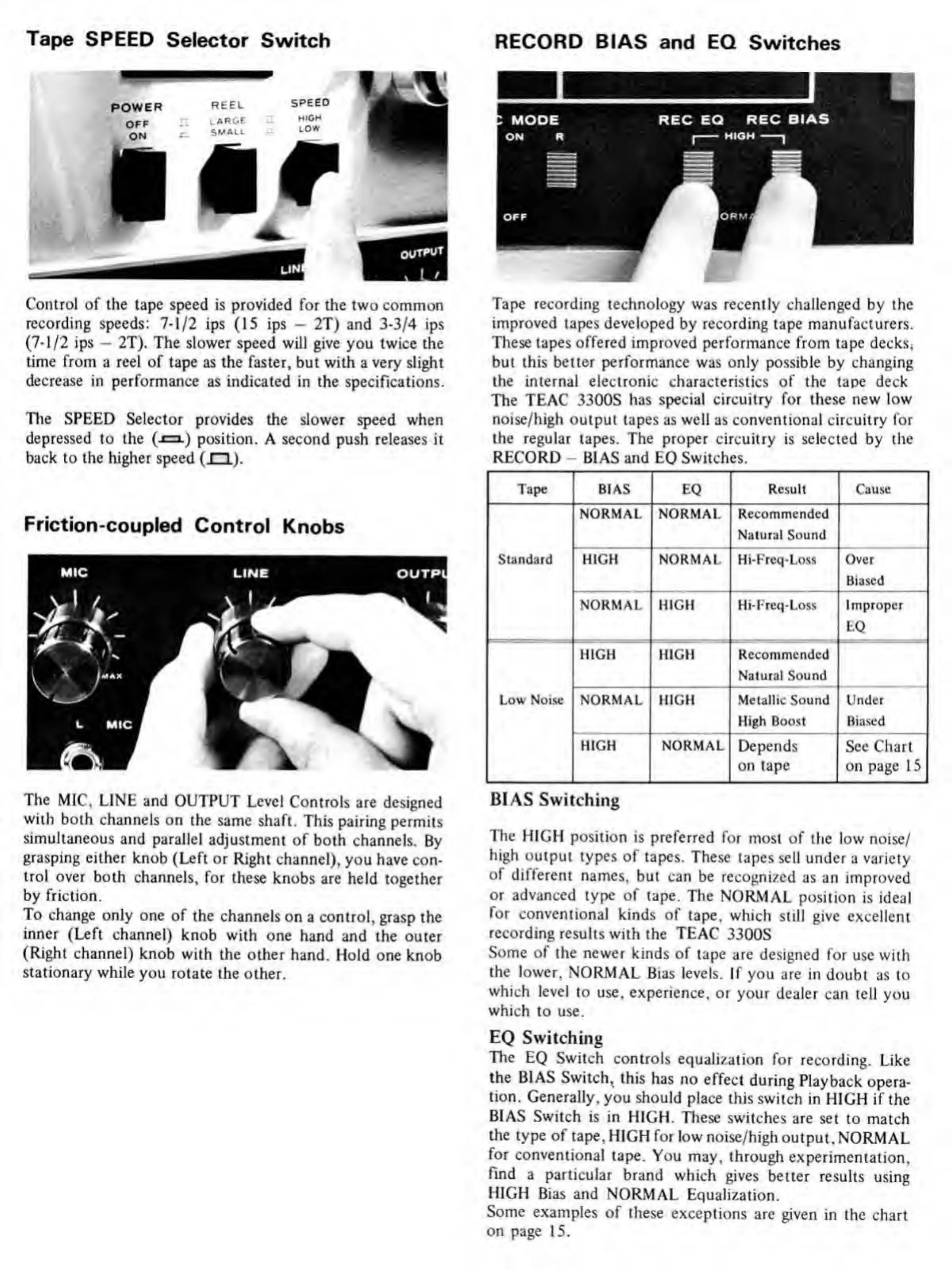 Teac A-3300S - Tape SPEED Selector Switch; Friction-Coupled Control Knobs.10; RECORD BIAS and EQ Switches