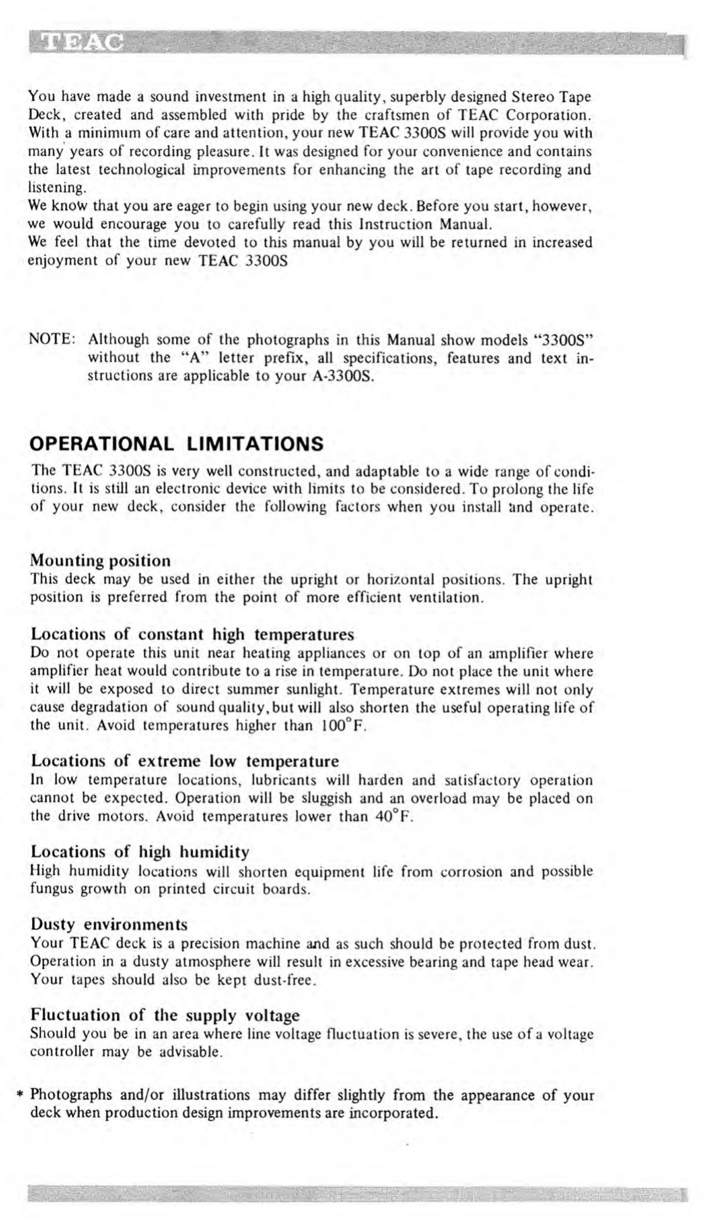 Teac A-3300S - Operational Limitations
