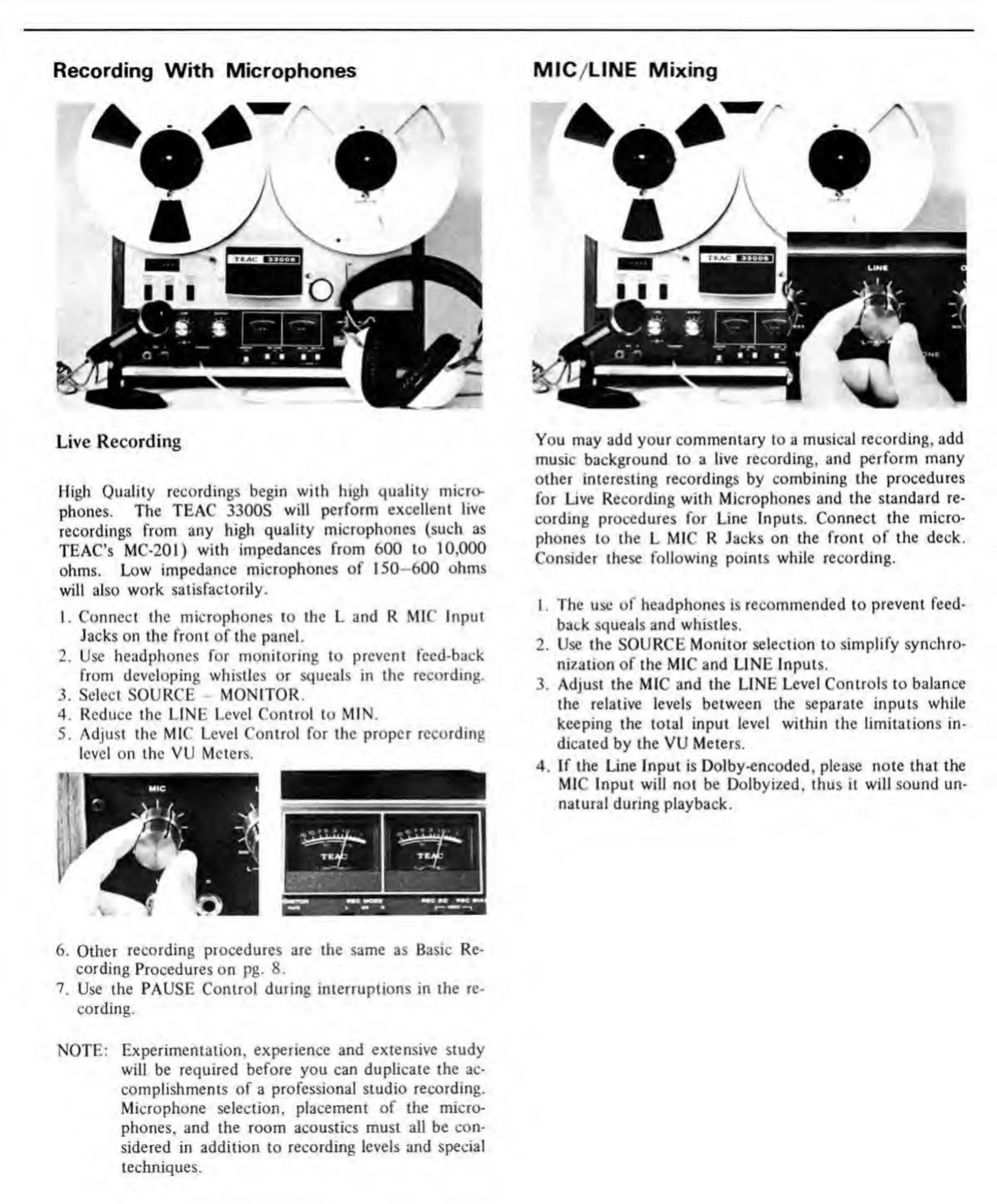 Teac A-3300S - Recording With Microphones; Live Recording Tips; MIC;LINE Mixing
