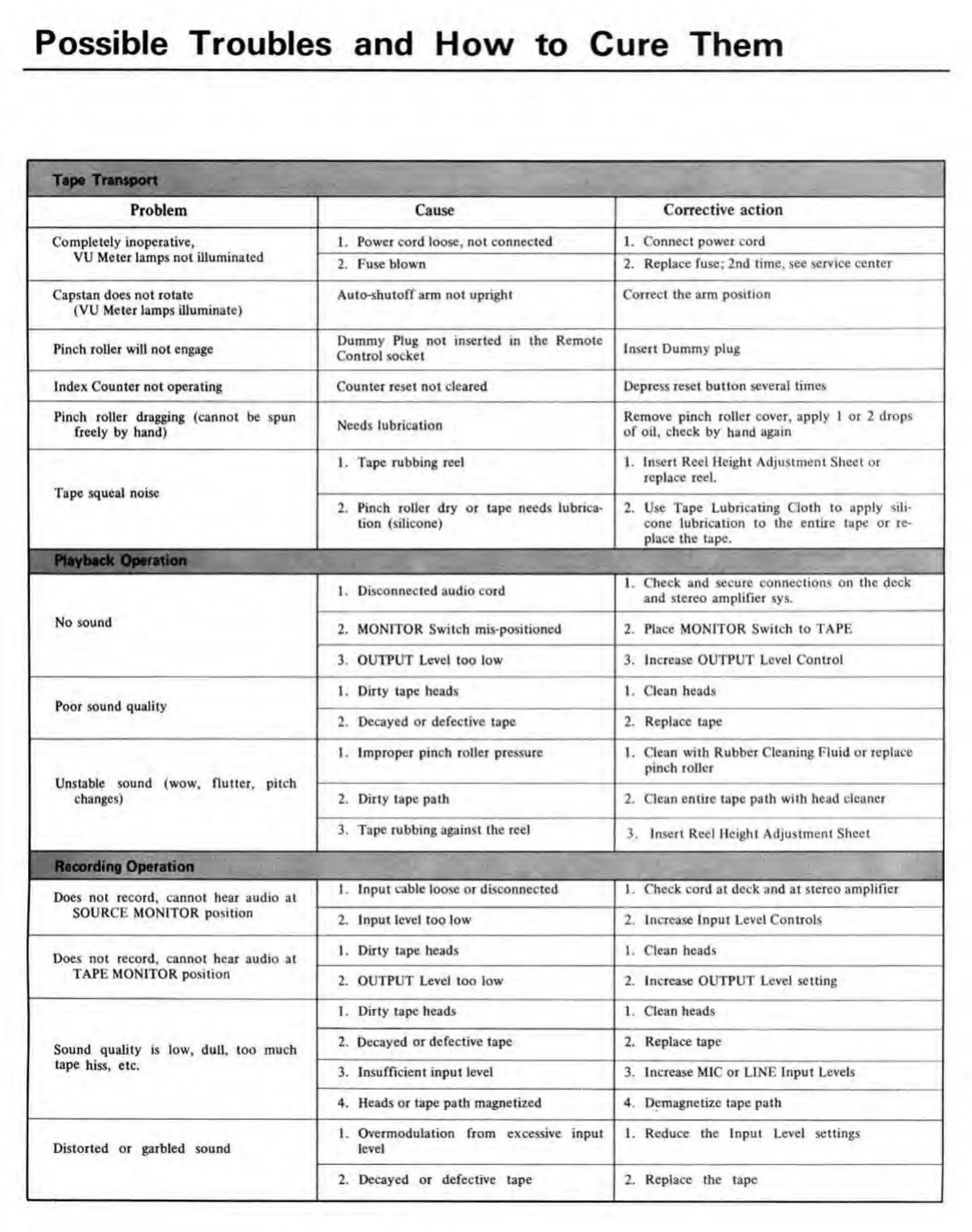Teac A-3300S - Possible Troubles and How to Cure Them; Tape Transport Problems; Playback Operation Problems; Recording Operation Problems