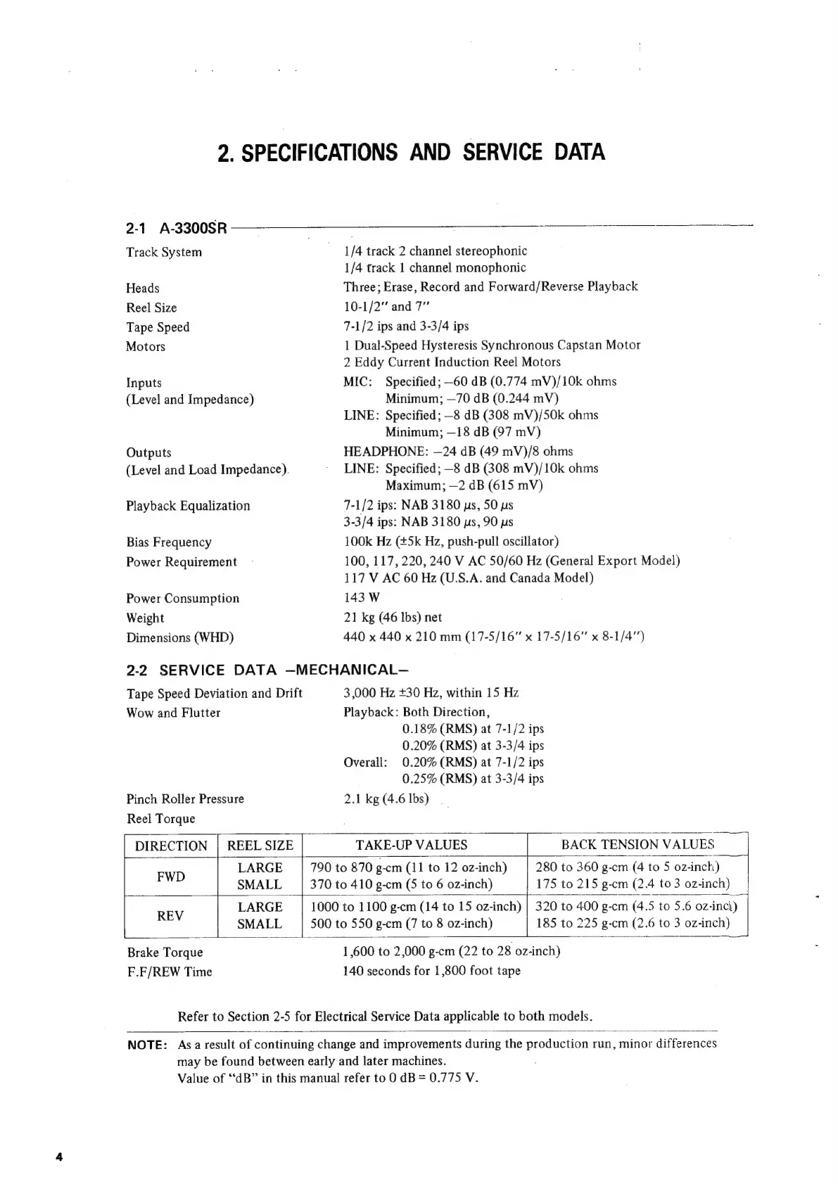 Teac A-3300SR - Specifications and Service Data; A-3300 SR Specifications; Mechanical Service Data