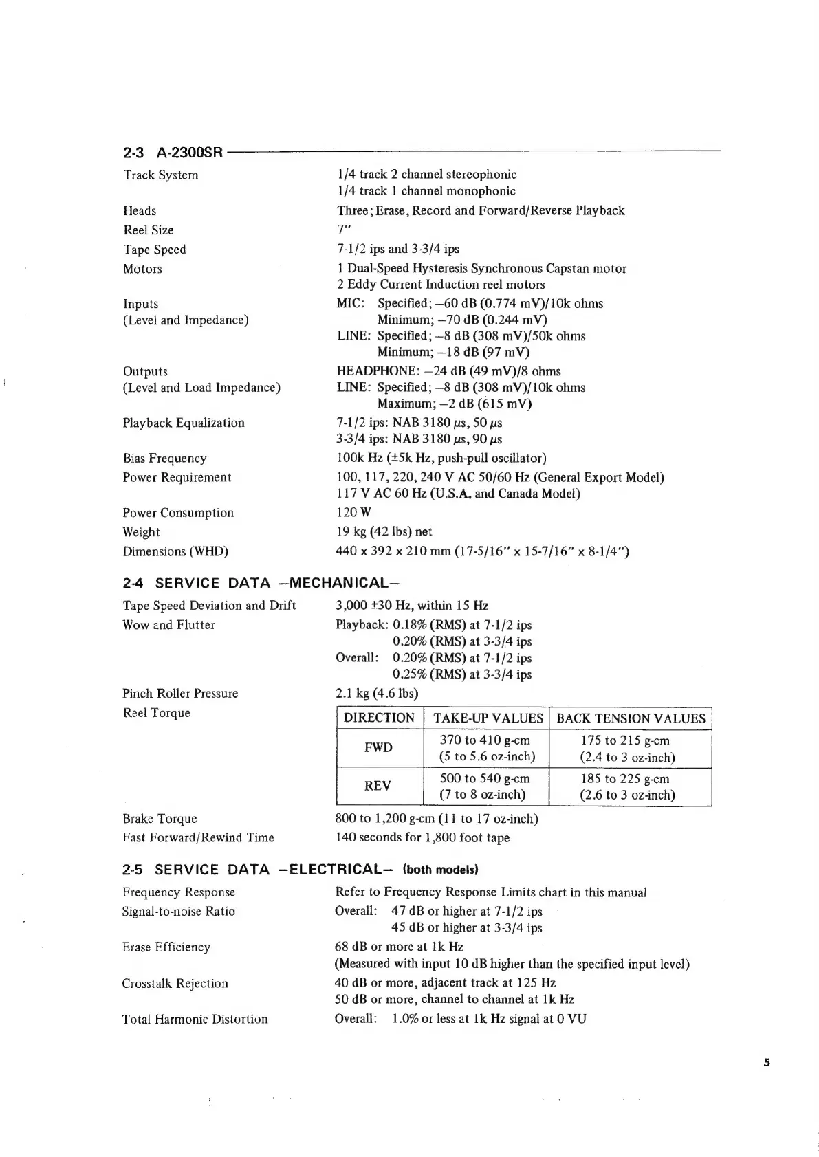 Teac A-3300SR - A-2300 SR Specifications; Electrical Service Data