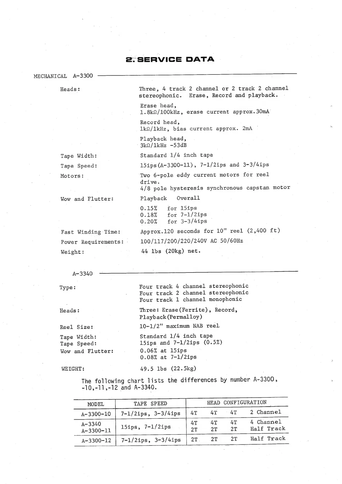 Teac A-3340 - 2. SERVICE DATA; MECHANICAL SPECIFICATIONS