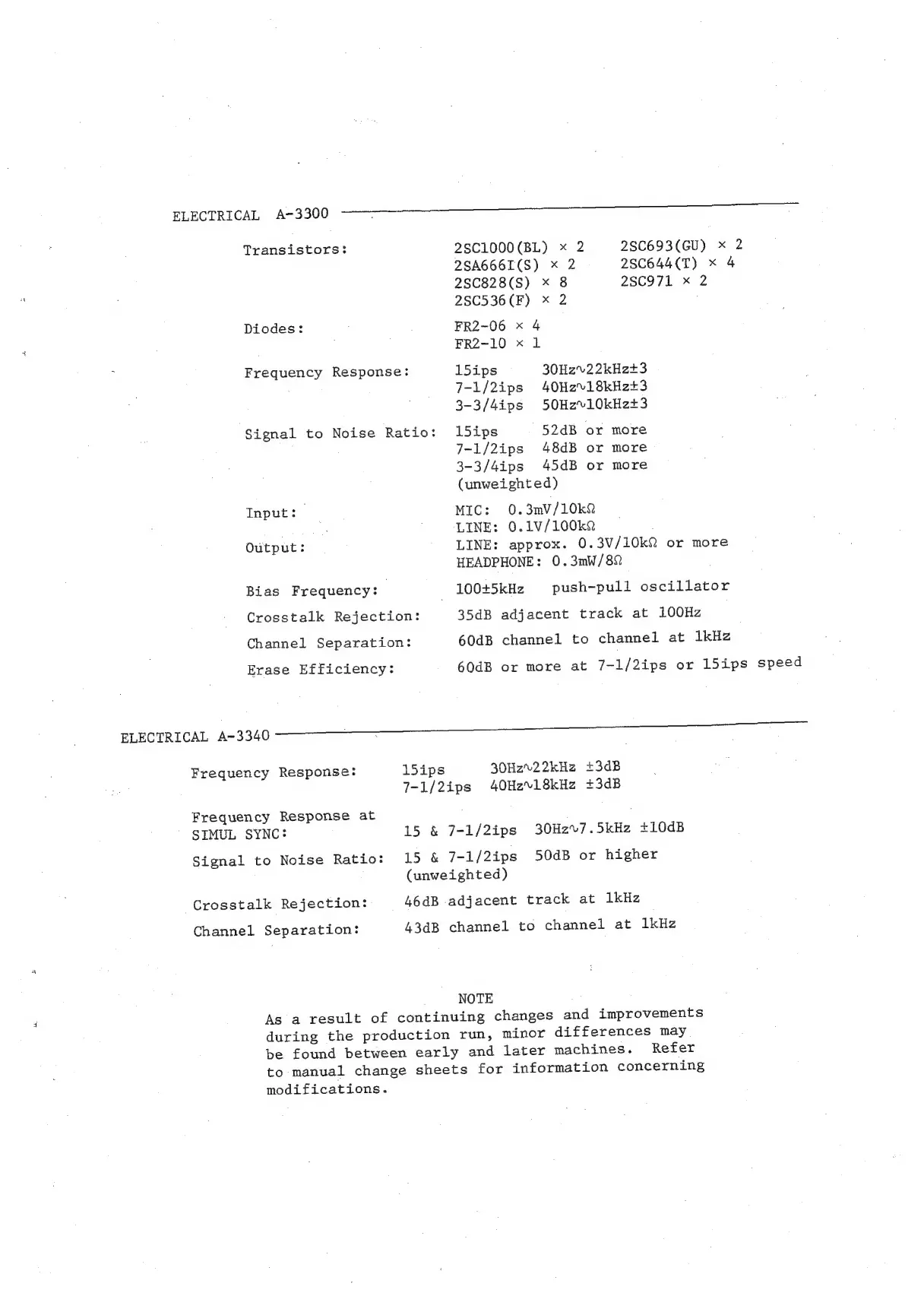 Teac A-3340 - ELECTRICAL SPECIFICATIONS; ELECTRICAL A-3300 SPECIFICATIONS; ELECTRICAL A-3340 SPECIFICATIONS