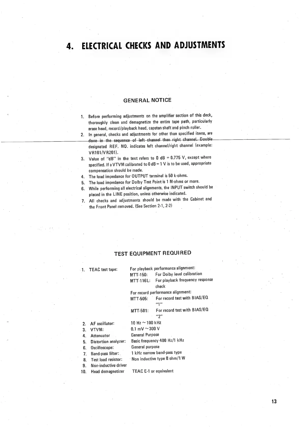Teac A-400 - Electrical Checks and Adjustments; General Electrical Procedures and Equipment