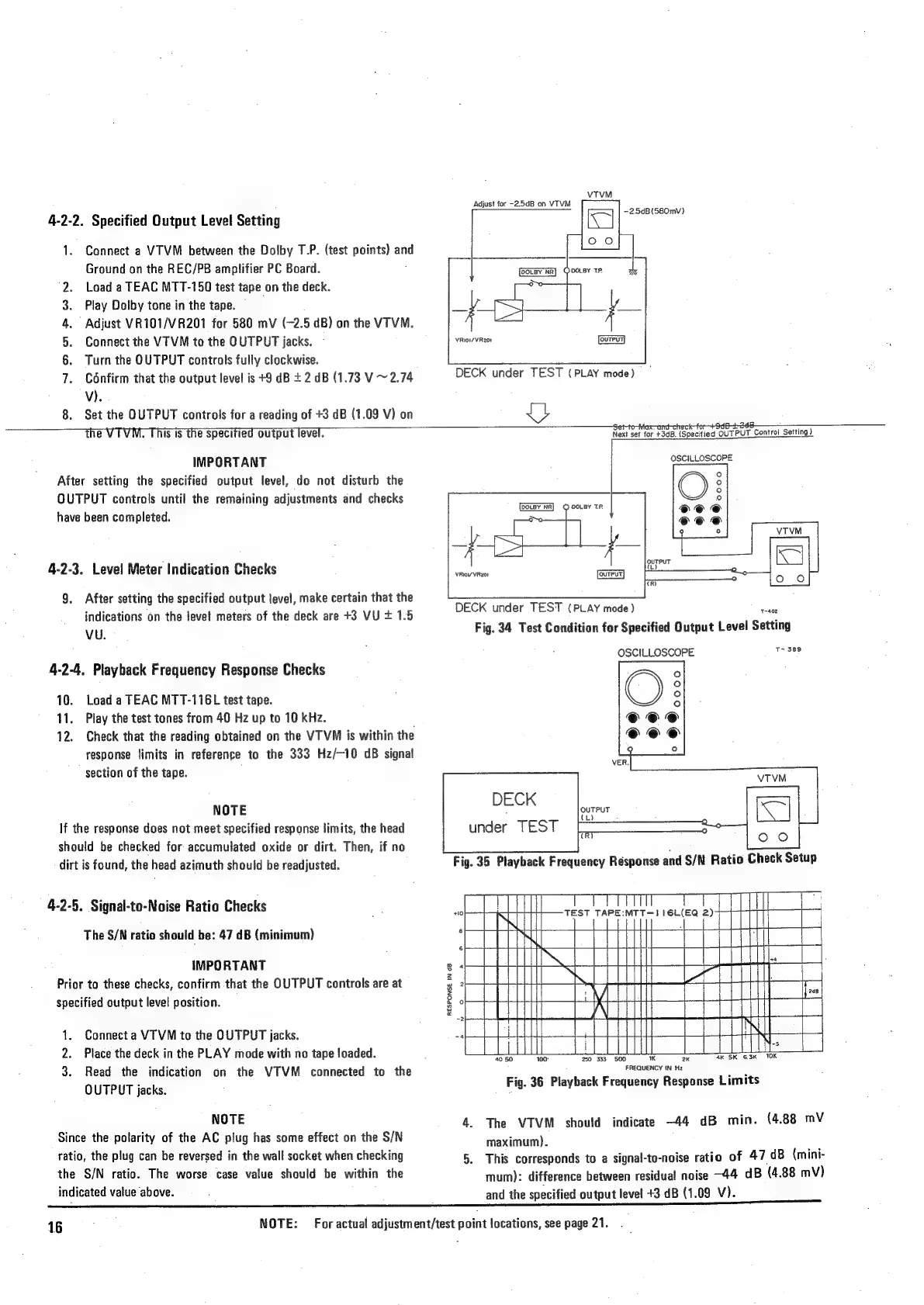 Teac A-400 - Specified Output Level Setting; Level Meter Indication Checks; Playback Frequency Response Checks