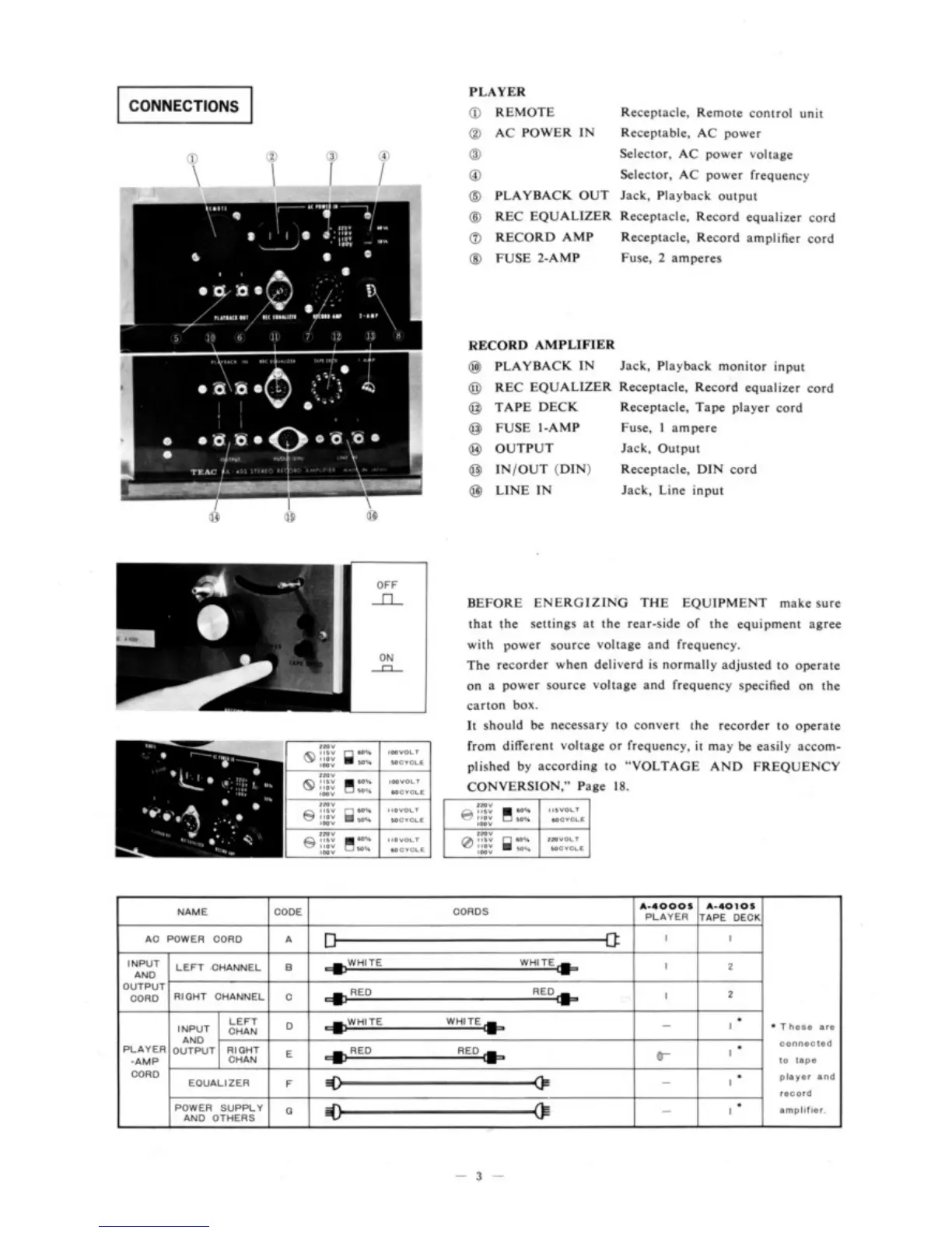 Teac A-4000S - Connections; Player; Record Amplifier; Before Energizing the Equipment