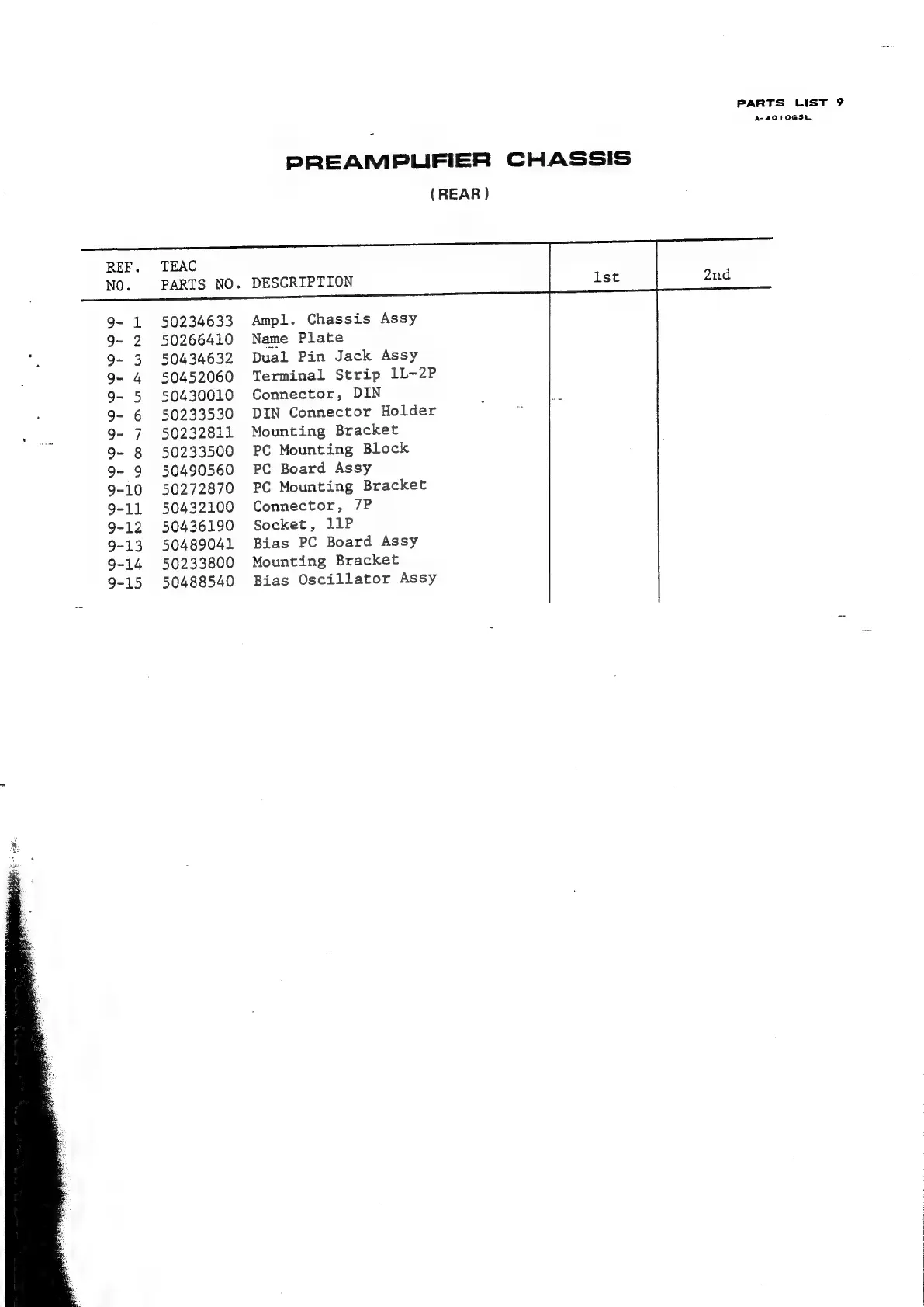 Teac A-4010GSL - Preamplifier Chassis (Rear) Parts List