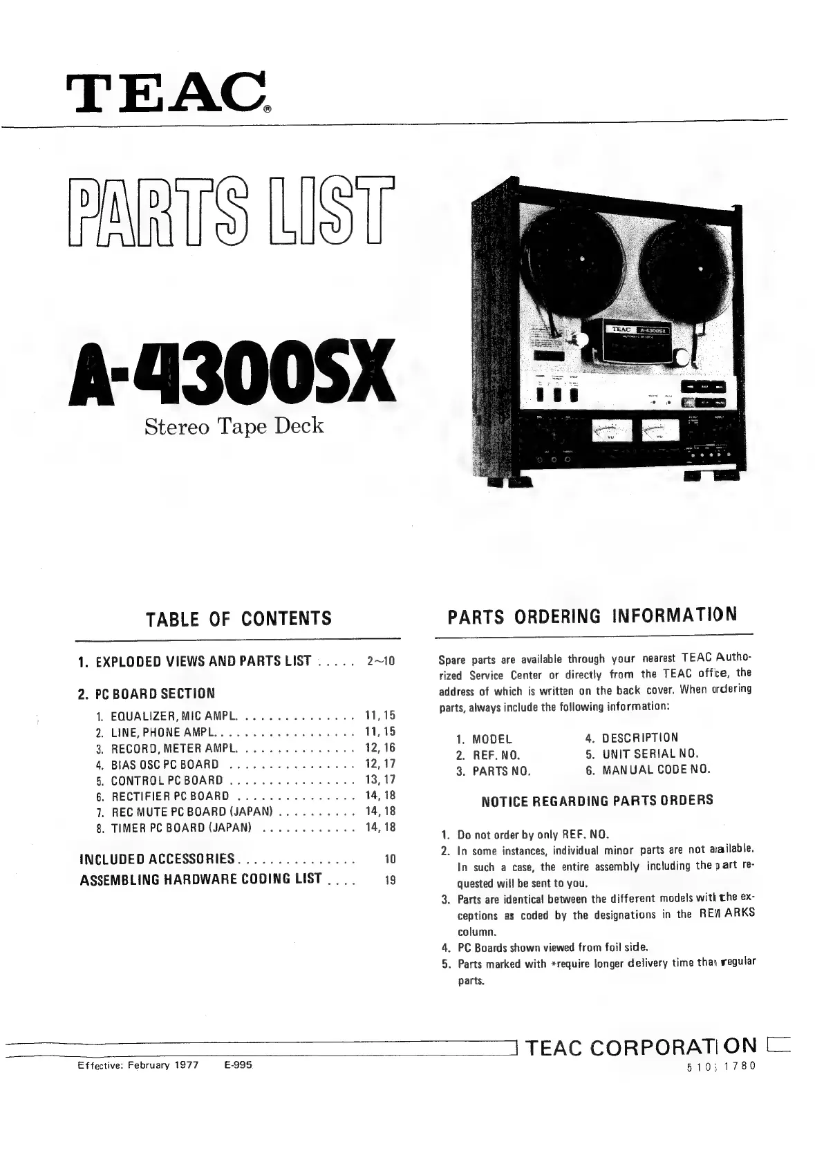 Teac A-4300SX - Parts List; Exploded Views and Parts List; PC Board Section; Assembling Hardware Coding List