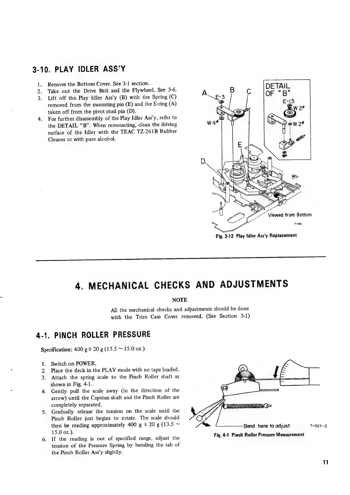 Teac A-450 - PLAY IDLER ASSY; MECHANICAL CHECKS AND ADJUSTMENTS; PINCH ROLLER PRESSURE