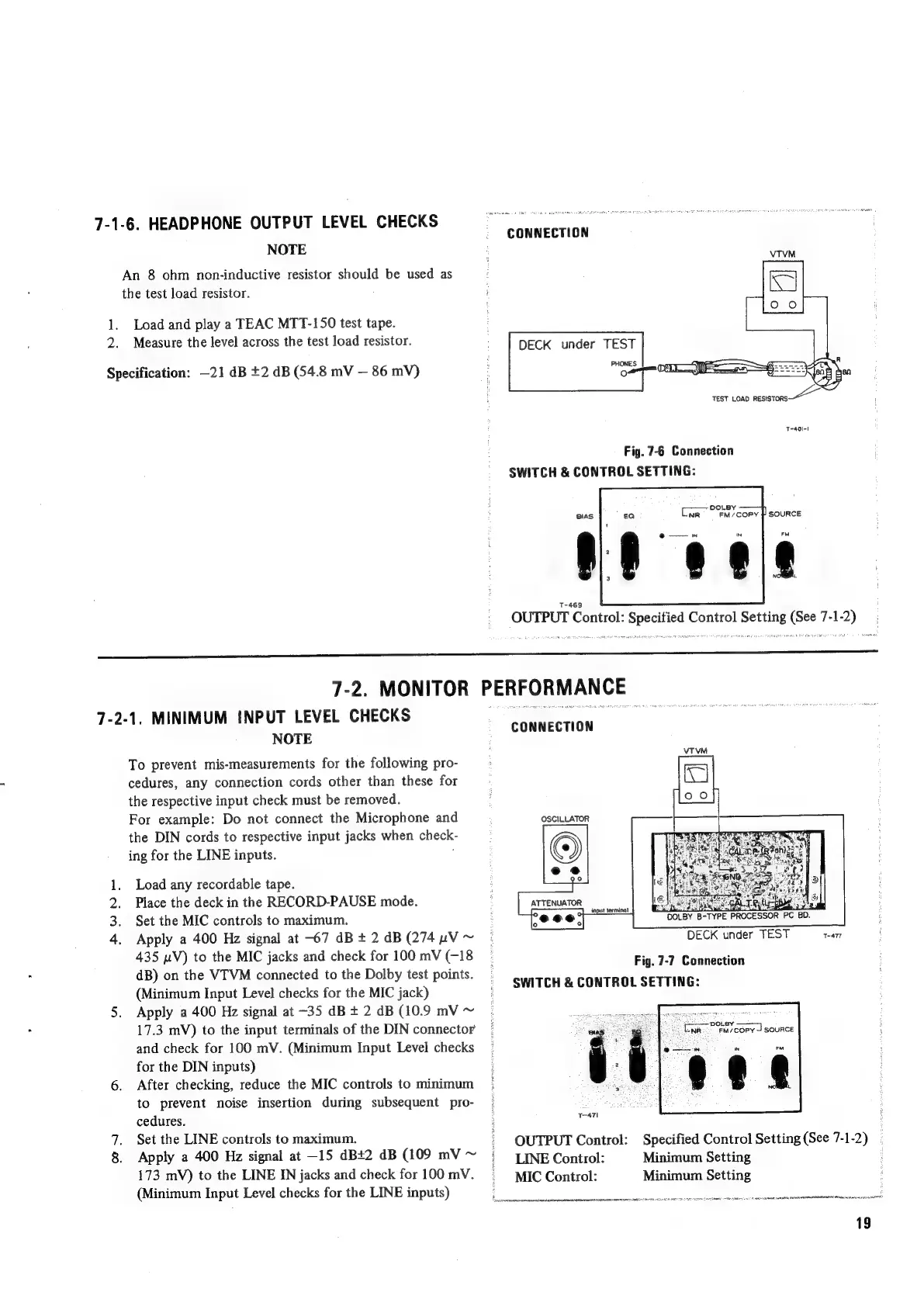Teac A-450 - HEADPHONE OUTPUT LEVEL CHECKS; MONITOR PERFORMANCE; MINIMUM INPUT LEVEL CHECKS