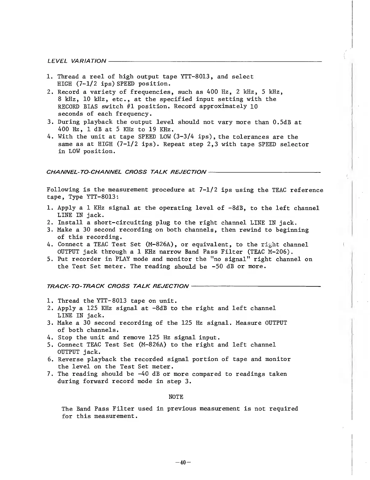 Teac A-6100 - Level Variation; Channel-to-Channel Cross Talk Rejection; Track-to-Track Cross Talk Rejection