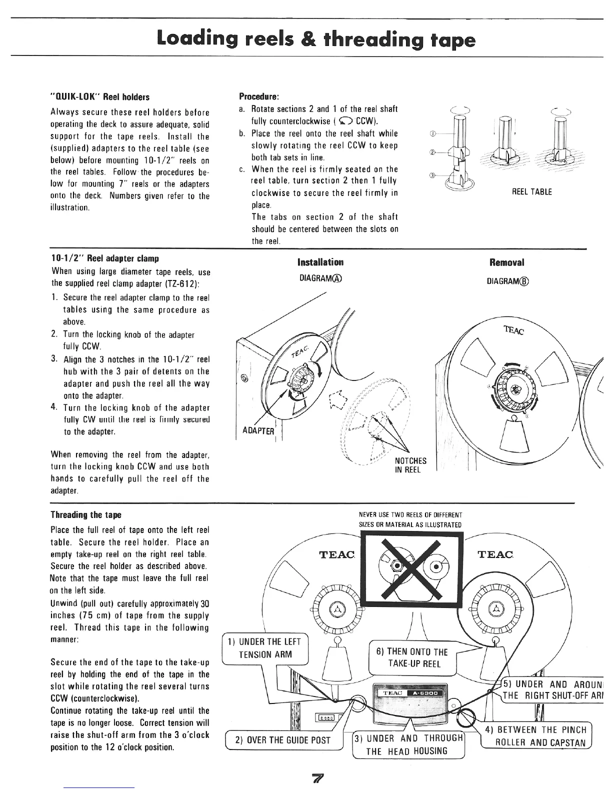 Teac A-6300 - Loading Reels & Threading Tape; Quik-Lok Reel Holders; Threading the Tape